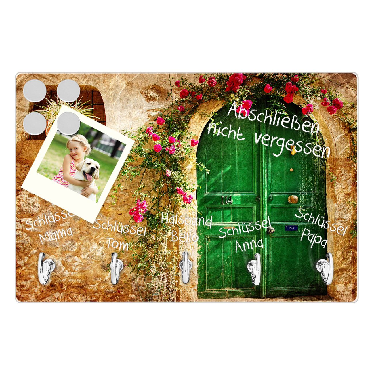 FUNKTION: Mit dem banjado Schlüsselbrett Ferienhaus hat Ihre Suche nach dem Schlüsselbund endlich ein Ende! Auf gesamt 5 Haken finden auch die größten Schlüssel ihren Platz. Durch den farbenfrohen Motivdruck ist das Schlüsselboard ein Blickfang in jeder Wohnung. DESIGN: Die Schlüsselleiste mit Motiv Ferienhaus hat ein sehr ansprechendes und ausgefallenes Design. Das Glasboard besteht aus einer gehärteten Glasscheibe mit dem Motiv Ihrer Wahl. Ihre neue Schlüsselaufbewahrung ist funktionell und ein optisches Highlight. DETAILS: Das Schlüsselbrett ist 30 x 20 x 4,5 CM (BxHxT). Das ganze Board besteht aus gehärtetem Sicherheitsglas, die Haken zur Selbstmontage präsentieren sich in Edelstahl-Optik. Für einen sicheren Halt erfolgt die Aufhängung an 2 vorgefertigten Haltern an der Rückseite. Das Montagematerial fügen wir bei. NUTZEN: Hier findet alles seinen Platz: Schlüsselbunde, Geschirrtücher, Hundeleinen oder Kinderjacken. Das Glas kann mit Kreidestiften bzw. Whiteboard-Marker beschrieben werden, mit extrastarken Neodym-Magneten können Sie auch Notizen anheften. BANJADO: Wir sind ein kleines Team aus dem Herzen von Sachsen und fertigen Ihre neue Schlüsselaufbewahrung von Hand an. Sie erhalten Handarbeit und keine preiswerte Importware. Wir hoffen, dass Ihnen unsere Idee zusagt, herzlichst das banjado Team.