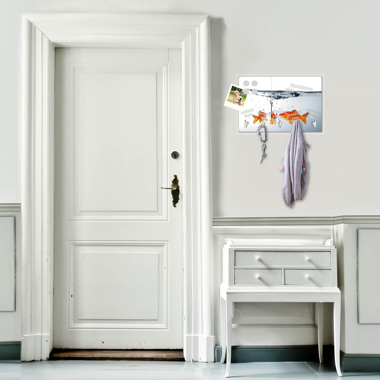 FUNKTION: Mit dem banjado Schlüsselbrett Fische hat Ihre Suche nach dem Schlüsselbund endlich ein Ende! Auf gesamt 5 Haken finden auch die größten Schlüssel ihren Platz. Durch den farbenfrohen Motivdruck ist das Schlüsselboard ein Blickfang in jeder Wohnung. DESIGN: Die Schlüsselleiste mit Motiv Fische hat ein sehr ansprechendes und ausgefallenes Design. Das Glasboard besteht aus einer gehärteten Glasscheibe mit dem Motiv Ihrer Wahl. Ihre neue Schlüsselaufbewahrung ist funktionell und ein optisches Highlight. DETAILS: Das Schlüsselbrett ist 30 x 20 x 4,5 CM (BxHxT). Das ganze Board besteht aus gehärtetem Sicherheitsglas, die Haken zur Selbstmontage präsentieren sich in Edelstahl-Optik. Für einen sicheren Halt erfolgt die Aufhängung an 2 vorgefertigten Haltern an der Rückseite. Das Montagematerial fügen wir bei. NUTZEN: Hier findet alles seinen Platz: Schlüsselbunde, Geschirrtücher, Hundeleinen oder Kinderjacken. Das Glas kann mit Kreidestiften bzw. Whiteboard-Marker beschrieben werden, mit extrastarken Neodym-Magneten können Sie auch Notizen anheften. BANJADO: Wir sind ein kleines Team aus dem Herzen von Sachsen und fertigen Ihre neue Schlüsselaufbewahrung von Hand an. Sie erhalten Handarbeit und keine preiswerte Importware. Wir hoffen, dass Ihnen unsere Idee zusagt, herzlichst das banjado Team.