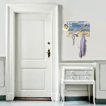 FUNKTION: Mit dem banjado Schlüsselbrett Flaschenpost hat Ihre Suche nach dem Schlüsselbund endlich ein Ende! Auf gesamt 5 Haken finden auch die größten Schlüssel ihren Platz. Durch den farbenfrohen Motivdruck ist das Schlüsselboard ein Blickfang in jeder Wohnung. DESIGN: Die Schlüsselleiste mit Motiv Flaschenpost hat ein sehr ansprechendes und ausgefallenes Design. Das Glasboard besteht aus einer gehärteten Glasscheibe mit dem Motiv Ihrer Wahl. Ihre neue Schlüsselaufbewahrung ist funktionell und ein optisches Highlight. DETAILS: Das Schlüsselbrett ist 30 x 20 x 4,5 CM (BxHxT). Das ganze Board besteht aus gehärtetem Sicherheitsglas, die Haken zur Selbstmontage präsentieren sich in Edelstahl-Optik. Für einen sicheren Halt erfolgt die Aufhängung an 2 vorgefertigten Haltern an der Rückseite. Das Montagematerial fügen wir bei. NUTZEN: Hier findet alles seinen Platz: Schlüsselbunde, Geschirrtücher, Hundeleinen oder Kinderjacken. Das Glas kann mit Kreidestiften bzw. Whiteboard-Marker beschrieben werden, mit extrastarken Neodym-Magneten können Sie auch Notizen anheften. BANJADO: Wir sind ein kleines Team aus dem Herzen von Sachsen und fertigen Ihre neue Schlüsselaufbewahrung von Hand an. Sie erhalten Handarbeit und keine preiswerte Importware. Wir hoffen, dass Ihnen unsere Idee zusagt, herzlichst das banjado Team.