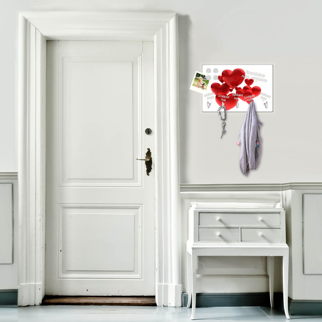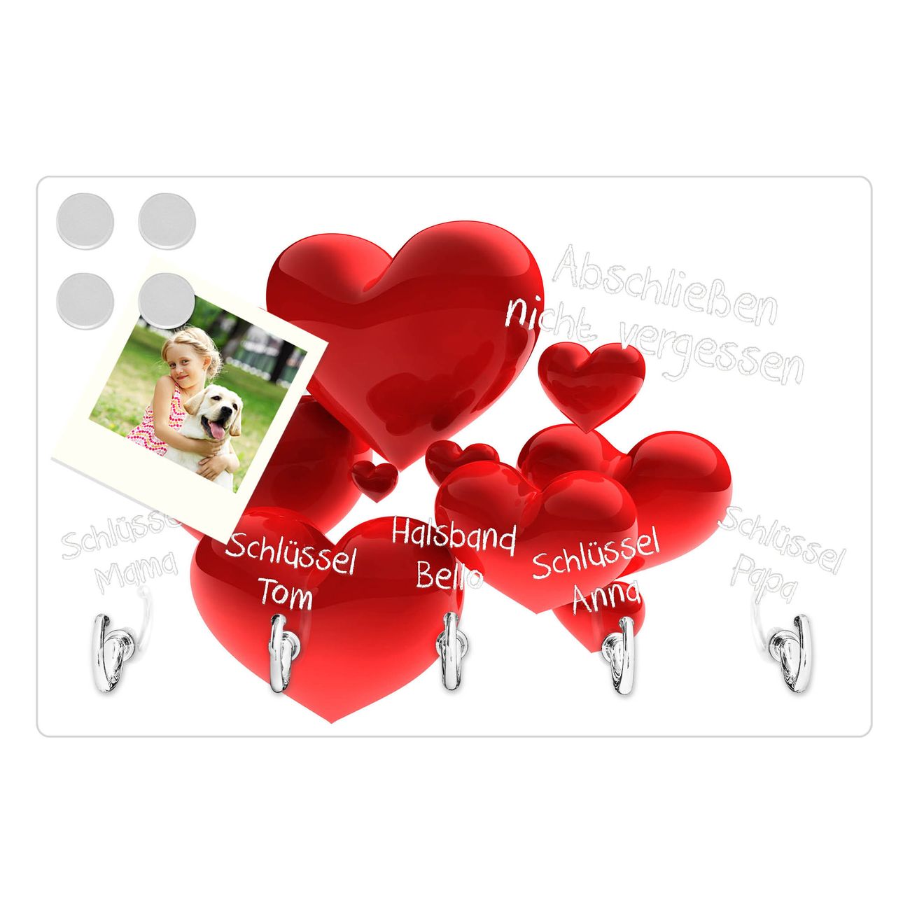 FUNKTION: Mit dem banjado Schlüsselbrett Fliegende Herzen hat Ihre Suche nach dem Schlüsselbund endlich ein Ende! Auf gesamt 5 Haken finden auch die größten Schlüssel ihren Platz. Durch den farbenfrohen Motivdruck ist das Schlüsselboard ein Blickfang in jeder Wohnung. DESIGN: Die Schlüsselleiste mit Motiv Fliegende Herzen hat ein sehr ansprechendes und ausgefallenes Design. Das Glasboard besteht aus einer gehärteten Glasscheibe mit dem Motiv Ihrer Wahl. Ihre neue Schlüsselaufbewahrung ist funktionell und ein optisches Highlight. DETAILS: Das Schlüsselbrett ist 30 x 20 x 4,5 CM (BxHxT). Das ganze Board besteht aus gehärtetem Sicherheitsglas, die Haken zur Selbstmontage präsentieren sich in Edelstahl-Optik. Für einen sicheren Halt erfolgt die Aufhängung an 2 vorgefertigten Haltern an der Rückseite. Das Montagematerial fügen wir bei. NUTZEN: Hier findet alles seinen Platz: Schlüsselbunde, Geschirrtücher, Hundeleinen oder Kinderjacken. Das Glas kann mit Kreidestiften bzw. Whiteboard-Marker beschrieben werden, mit extrastarken Neodym-Magneten können Sie auch Notizen anheften. BANJADO: Wir sind ein kleines Team aus dem Herzen von Sachsen und fertigen Ihre neue Schlüsselaufbewahrung von Hand an. Sie erhalten Handarbeit und keine preiswerte Importware. Wir hoffen, dass Ihnen unsere Idee zusagt, herzlichst das banjado Team.
