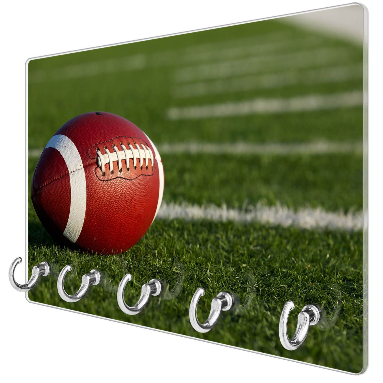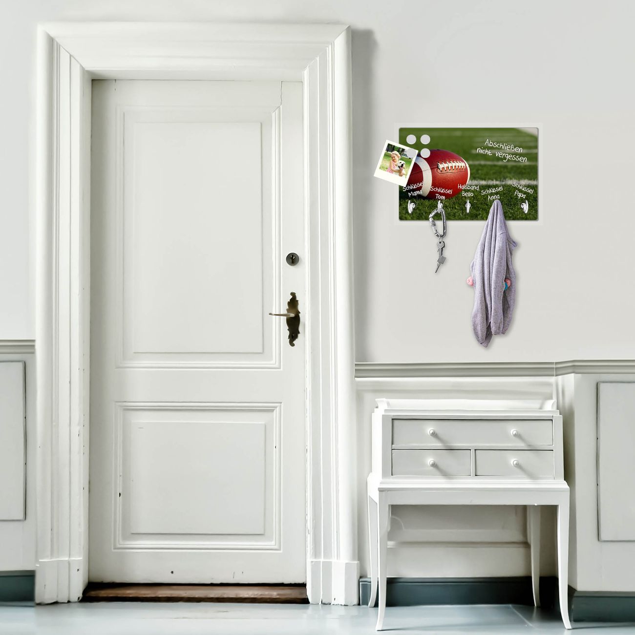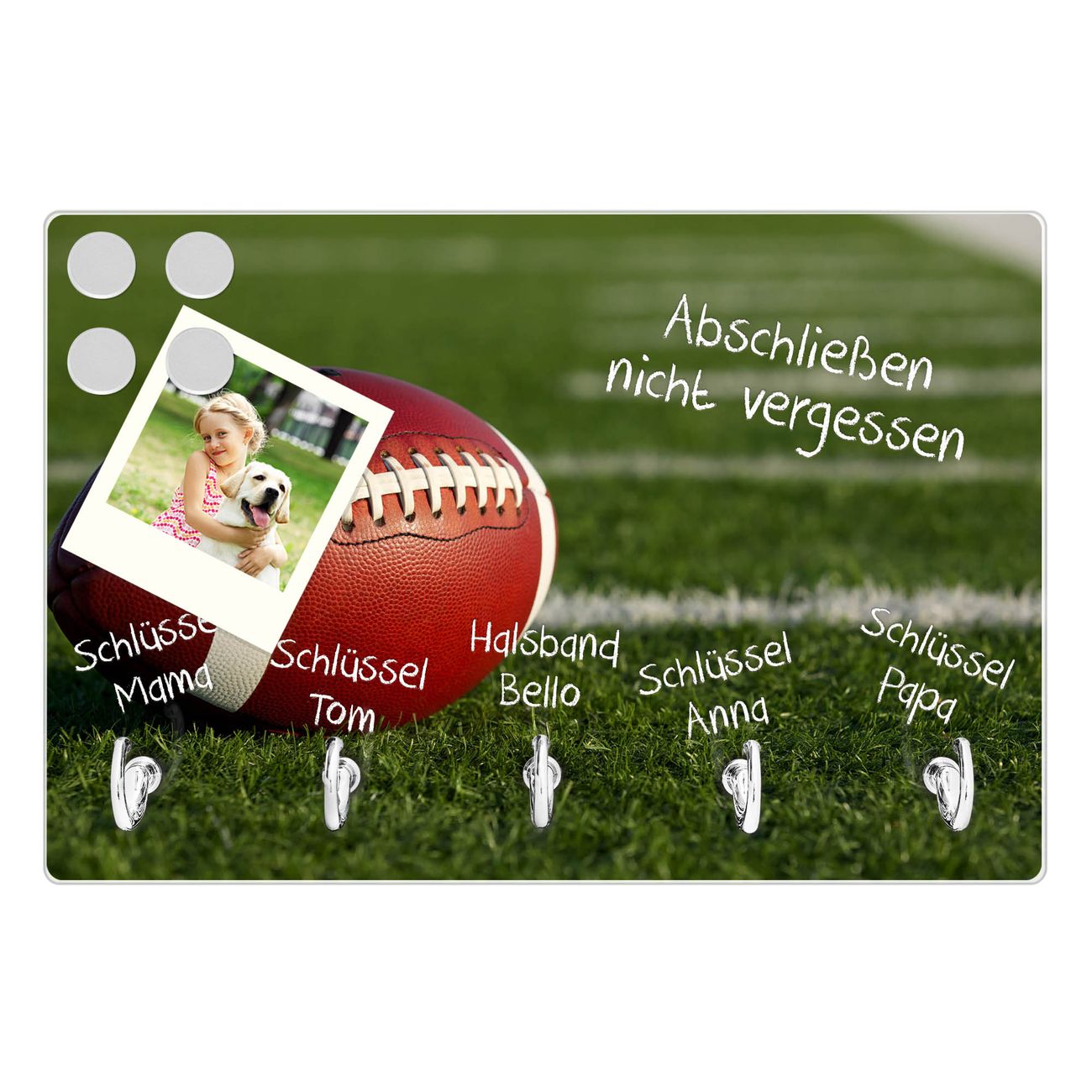 FUNKTION: Mit dem banjado Schlüsselbrett Football hat Ihre Suche nach dem Schlüsselbund endlich ein Ende! Auf gesamt 5 Haken finden auch die größten Schlüssel ihren Platz. Durch den farbenfrohen Motivdruck ist das Schlüsselboard ein Blickfang in jeder Wohnung. DESIGN: Die Schlüsselleiste mit Motiv Football hat ein sehr ansprechendes und ausgefallenes Design. Das Glasboard besteht aus einer gehärteten Glasscheibe mit dem Motiv Ihrer Wahl. Ihre neue Schlüsselaufbewahrung ist funktionell und ein optisches Highlight. DETAILS: Das Schlüsselbrett ist 30 x 20 x 4,5 CM (BxHxT). Das ganze Board besteht aus gehärtetem Sicherheitsglas, die Haken zur Selbstmontage präsentieren sich in Edelstahl-Optik. Für einen sicheren Halt erfolgt die Aufhängung an 2 vorgefertigten Haltern an der Rückseite. Das Montagematerial fügen wir bei. NUTZEN: Hier findet alles seinen Platz: Schlüsselbunde, Geschirrtücher, Hundeleinen oder Kinderjacken. Das Glas kann mit Kreidestiften bzw. Whiteboard-Marker beschrieben werden, mit extrastarken Neodym-Magneten können Sie auch Notizen anheften. BANJADO: Wir sind ein kleines Team aus dem Herzen von Sachsen und fertigen Ihre neue Schlüsselaufbewahrung von Hand an. Sie erhalten Handarbeit und keine preiswerte Importware. Wir hoffen, dass Ihnen unsere Idee zusagt, herzlichst das banjado Team.