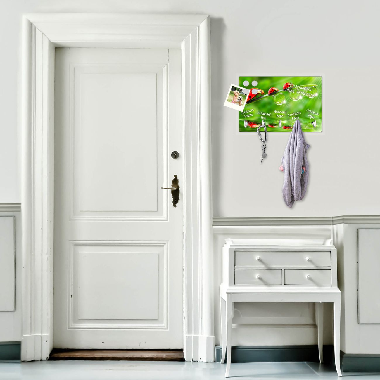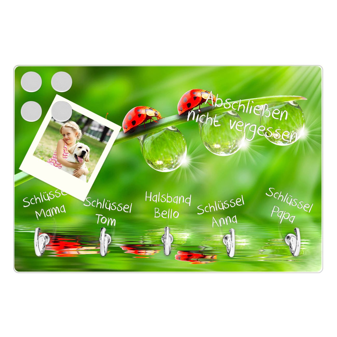 FUNKTION: Mit dem banjado Schlüsselbrett Für Jeden Einen hat Ihre Suche nach dem Schlüsselbund endlich ein Ende! Auf gesamt 5 Haken finden auch die größten Schlüssel ihren Platz. Durch den farbenfrohen Motivdruck ist das Schlüsselboard ein Blickfang in jeder Wohnung. DESIGN: Die Schlüsselleiste mit Motiv Für Jeden Einen hat ein sehr ansprechendes und ausgefallenes Design. Das Glasboard besteht aus einer gehärteten Glasscheibe mit dem Motiv Ihrer Wahl. Ihre neue Schlüsselaufbewahrung ist funktionell und ein optisches Highlight. DETAILS: Das Schlüsselbrett ist 30 x 20 x 4,5 CM (BxHxT). Das ganze Board besteht aus gehärtetem Sicherheitsglas, die Haken zur Selbstmontage präsentieren sich in Edelstahl-Optik. Für einen sicheren Halt erfolgt die Aufhängung an 2 vorgefertigten Haltern an der Rückseite. Das Montagematerial fügen wir bei. NUTZEN: Hier findet alles seinen Platz: Schlüsselbunde, Geschirrtücher, Hundeleinen oder Kinderjacken. Das Glas kann mit Kreidestiften bzw. Whiteboard-Marker beschrieben werden, mit extrastarken Neodym-Magneten können Sie auch Notizen anheften. BANJADO: Wir sind ein kleines Team aus dem Herzen von Sachsen und fertigen Ihre neue Schlüsselaufbewahrung von Hand an. Sie erhalten Handarbeit und keine preiswerte Importware. Wir hoffen, dass Ihnen unsere Idee zusagt, herzlichst das banjado Team.
