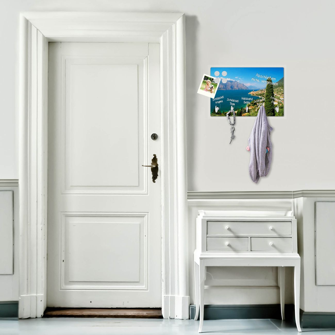 FUNKTION: Mit dem banjado Schlüsselbrett Gardasee hat Ihre Suche nach dem Schlüsselbund endlich ein Ende! Auf gesamt 5 Haken finden auch die größten Schlüssel ihren Platz. Durch den farbenfrohen Motivdruck ist das Schlüsselboard ein Blickfang in jeder Wohnung. DESIGN: Die Schlüsselleiste mit Motiv Gardasee hat ein sehr ansprechendes und ausgefallenes Design. Das Glasboard besteht aus einer gehärteten Glasscheibe mit dem Motiv Ihrer Wahl. Ihre neue Schlüsselaufbewahrung ist funktionell und ein optisches Highlight. DETAILS: Das Schlüsselbrett ist 30 x 20 x 4,5 CM (BxHxT). Das ganze Board besteht aus gehärtetem Sicherheitsglas, die Haken zur Selbstmontage präsentieren sich in Edelstahl-Optik. Für einen sicheren Halt erfolgt die Aufhängung an 2 vorgefertigten Haltern an der Rückseite. Das Montagematerial fügen wir bei. NUTZEN: Hier findet alles seinen Platz: Schlüsselbunde, Geschirrtücher, Hundeleinen oder Kinderjacken. Das Glas kann mit Kreidestiften bzw. Whiteboard-Marker beschrieben werden, mit extrastarken Neodym-Magneten können Sie auch Notizen anheften. BANJADO: Wir sind ein kleines Team aus dem Herzen von Sachsen und fertigen Ihre neue Schlüsselaufbewahrung von Hand an. Sie erhalten Handarbeit und keine preiswerte Importware. Wir hoffen, dass Ihnen unsere Idee zusagt, herzlichst das banjado Team.