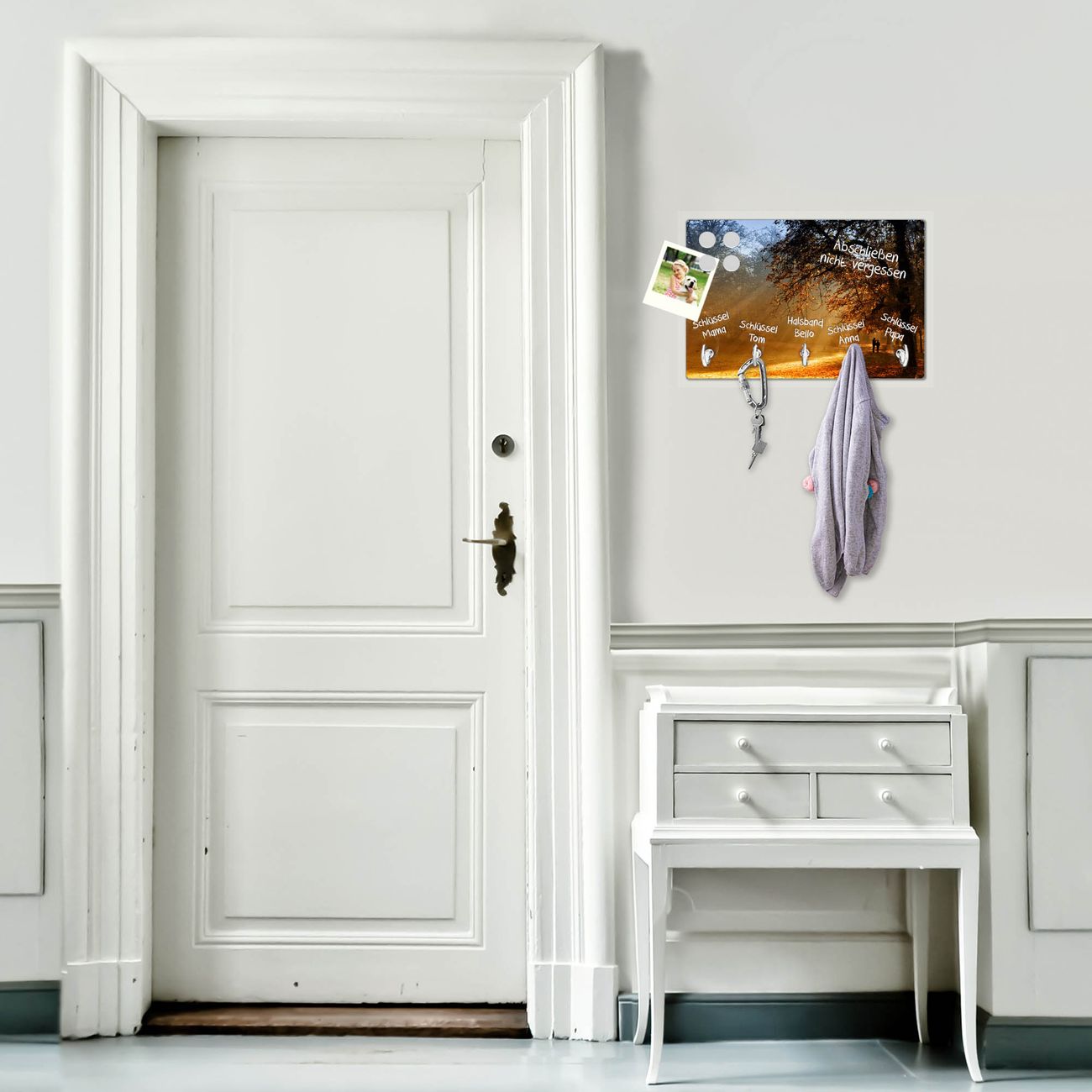 FUNKTION: Mit dem banjado Schlüsselbrett Goldener Herbst hat Ihre Suche nach dem Schlüsselbund endlich ein Ende! Auf gesamt 5 Haken finden auch die größten Schlüssel ihren Platz. Durch den farbenfrohen Motivdruck ist das Schlüsselboard ein Blickfang in jeder Wohnung. DESIGN: Die Schlüsselleiste mit Motiv Goldener Herbst hat ein sehr ansprechendes und ausgefallenes Design. Das Glasboard besteht aus einer gehärteten Glasscheibe mit dem Motiv Ihrer Wahl. Ihre neue Schlüsselaufbewahrung ist funktionell und ein optisches Highlight. DETAILS: Das Schlüsselbrett ist 30 x 20 x 4,5 CM (BxHxT). Das ganze Board besteht aus gehärtetem Sicherheitsglas, die Haken zur Selbstmontage präsentieren sich in Edelstahl-Optik. Für einen sicheren Halt erfolgt die Aufhängung an 2 vorgefertigten Haltern an der Rückseite. Das Montagematerial fügen wir bei. NUTZEN: Hier findet alles seinen Platz: Schlüsselbunde, Geschirrtücher, Hundeleinen oder Kinderjacken. Das Glas kann mit Kreidestiften bzw. Whiteboard-Marker beschrieben werden, mit extrastarken Neodym-Magneten können Sie auch Notizen anheften. BANJADO: Wir sind ein kleines Team aus dem Herzen von Sachsen und fertigen Ihre neue Schlüsselaufbewahrung von Hand an. Sie erhalten Handarbeit und keine preiswerte Importware. Wir hoffen, dass Ihnen unsere Idee zusagt, herzlichst das banjado Team.