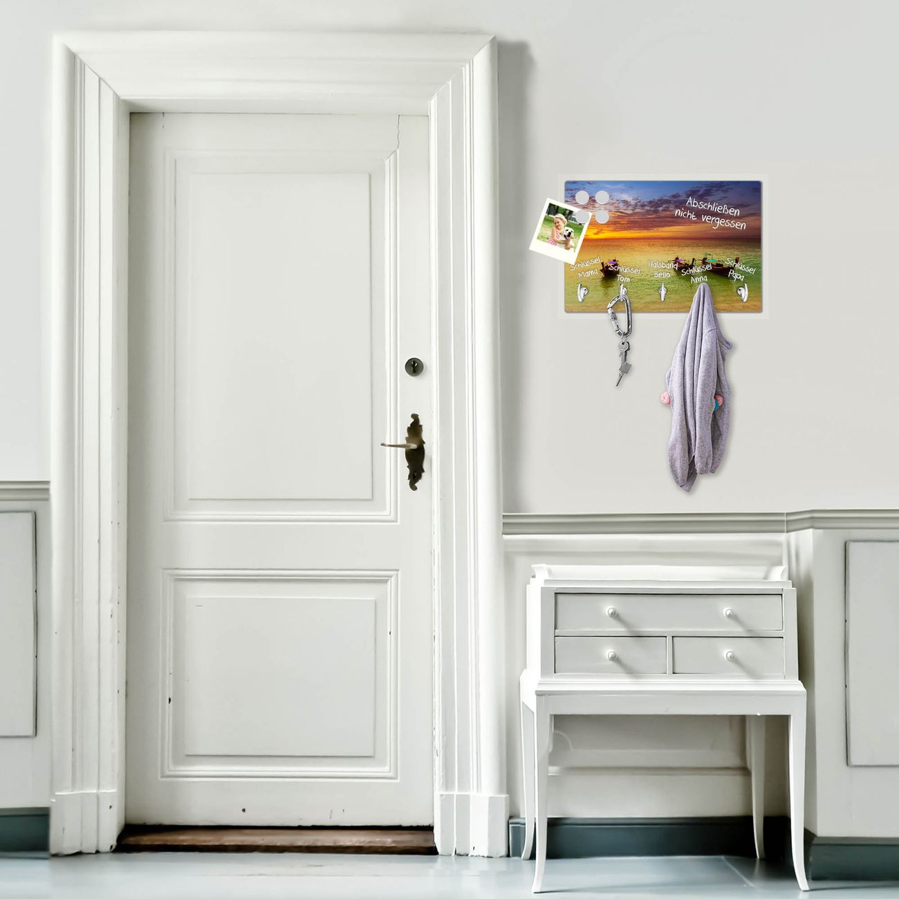 FUNKTION: Mit dem banjado Schlüsselbrett Golf Von Thailand hat Ihre Suche nach dem Schlüsselbund endlich ein Ende! Auf gesamt 5 Haken finden auch die größten Schlüssel ihren Platz. Durch den farbenfrohen Motivdruck ist das Schlüsselboard ein Blickfang in jeder Wohnung. DESIGN: Die Schlüsselleiste mit Motiv Golf Von Thailand hat ein sehr ansprechendes und ausgefallenes Design. Das Glasboard besteht aus einer gehärteten Glasscheibe mit dem Motiv Ihrer Wahl. Ihre neue Schlüsselaufbewahrung ist funktionell und ein optisches Highlight. DETAILS: Das Schlüsselbrett ist 30 x 20 x 4,5 CM (BxHxT). Das ganze Board besteht aus gehärtetem Sicherheitsglas, die Haken zur Selbstmontage präsentieren sich in Edelstahl-Optik. Für einen sicheren Halt erfolgt die Aufhängung an 2 vorgefertigten Haltern an der Rückseite. Das Montagematerial fügen wir bei. NUTZEN: Hier findet alles seinen Platz: Schlüsselbunde, Geschirrtücher, Hundeleinen oder Kinderjacken. Das Glas kann mit Kreidestiften bzw. Whiteboard-Marker beschrieben werden, mit extrastarken Neodym-Magneten können Sie auch Notizen anheften. BANJADO: Wir sind ein kleines Team aus dem Herzen von Sachsen und fertigen Ihre neue Schlüsselaufbewahrung von Hand an. Sie erhalten Handarbeit und keine preiswerte Importware. Wir hoffen, dass Ihnen unsere Idee zusagt, herzlichst das banjado Team.