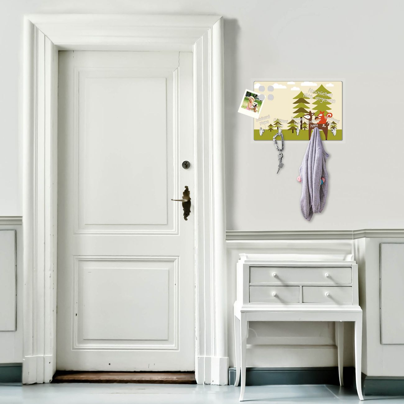 FUNKTION: Mit dem banjado Schlüsselbrett Heimweg hat Ihre Suche nach dem Schlüsselbund endlich ein Ende! Auf gesamt 5 Haken finden auch die größten Schlüssel ihren Platz. Durch den farbenfrohen Motivdruck ist das Schlüsselboard ein Blickfang in jeder Wohnung. DESIGN: Die Schlüsselleiste mit Motiv Heimweg hat ein sehr ansprechendes und ausgefallenes Design. Das Glasboard besteht aus einer gehärteten Glasscheibe mit dem Motiv Ihrer Wahl. Ihre neue Schlüsselaufbewahrung ist funktionell und ein optisches Highlight. DETAILS: Das Schlüsselbrett ist 30 x 20 x 4,5 CM (BxHxT). Das ganze Board besteht aus gehärtetem Sicherheitsglas, die Haken zur Selbstmontage präsentieren sich in Edelstahl-Optik. Für einen sicheren Halt erfolgt die Aufhängung an 2 vorgefertigten Haltern an der Rückseite. Das Montagematerial fügen wir bei. NUTZEN: Hier findet alles seinen Platz: Schlüsselbunde, Geschirrtücher, Hundeleinen oder Kinderjacken. Das Glas kann mit Kreidestiften bzw. Whiteboard-Marker beschrieben werden, mit extrastarken Neodym-Magneten können Sie auch Notizen anheften. BANJADO: Wir sind ein kleines Team aus dem Herzen von Sachsen und fertigen Ihre neue Schlüsselaufbewahrung von Hand an. Sie erhalten Handarbeit und keine preiswerte Importware. Wir hoffen, dass Ihnen unsere Idee zusagt, herzlichst das banjado Team.