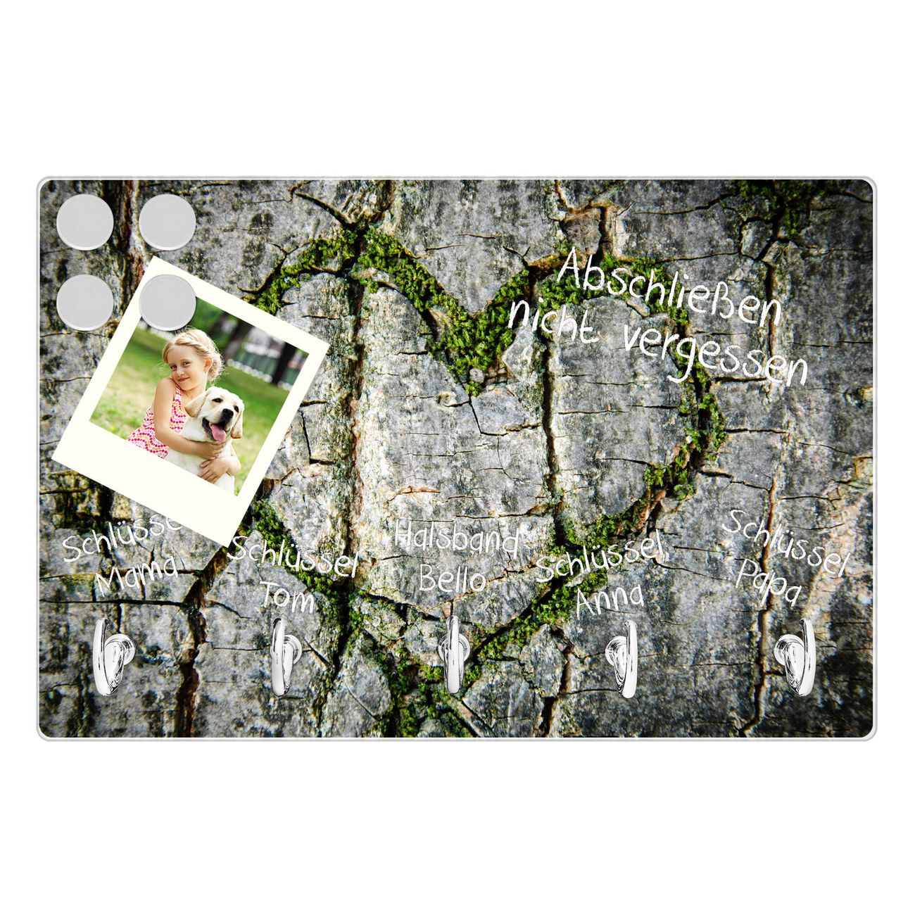 FUNKTION: Mit dem banjado Schlüsselbrett Herz Aus Moos hat Ihre Suche nach dem Schlüsselbund endlich ein Ende! Auf gesamt 5 Haken finden auch die größten Schlüssel ihren Platz. Durch den farbenfrohen Motivdruck ist das Schlüsselboard ein Blickfang in jeder Wohnung. DESIGN: Die Schlüsselleiste mit Motiv Herz Aus Moos hat ein sehr ansprechendes und ausgefallenes Design. Das Glasboard besteht aus einer gehärteten Glasscheibe mit dem Motiv Ihrer Wahl. Ihre neue Schlüsselaufbewahrung ist funktionell und ein optisches Highlight. DETAILS: Das Schlüsselbrett ist 30 x 20 x 4,5 CM (BxHxT). Das ganze Board besteht aus gehärtetem Sicherheitsglas, die Haken zur Selbstmontage präsentieren sich in Edelstahl-Optik. Für einen sicheren Halt erfolgt die Aufhängung an 2 vorgefertigten Haltern an der Rückseite. Das Montagematerial fügen wir bei. NUTZEN: Hier findet alles seinen Platz: Schlüsselbunde, Geschirrtücher, Hundeleinen oder Kinderjacken. Das Glas kann mit Kreidestiften bzw. Whiteboard-Marker beschrieben werden, mit extrastarken Neodym-Magneten können Sie auch Notizen anheften. BANJADO: Wir sind ein kleines Team aus dem Herzen von Sachsen und fertigen Ihre neue Schlüsselaufbewahrung von Hand an. Sie erhalten Handarbeit und keine preiswerte Importware. Wir hoffen, dass Ihnen unsere Idee zusagt, herzlichst das banjado Team.