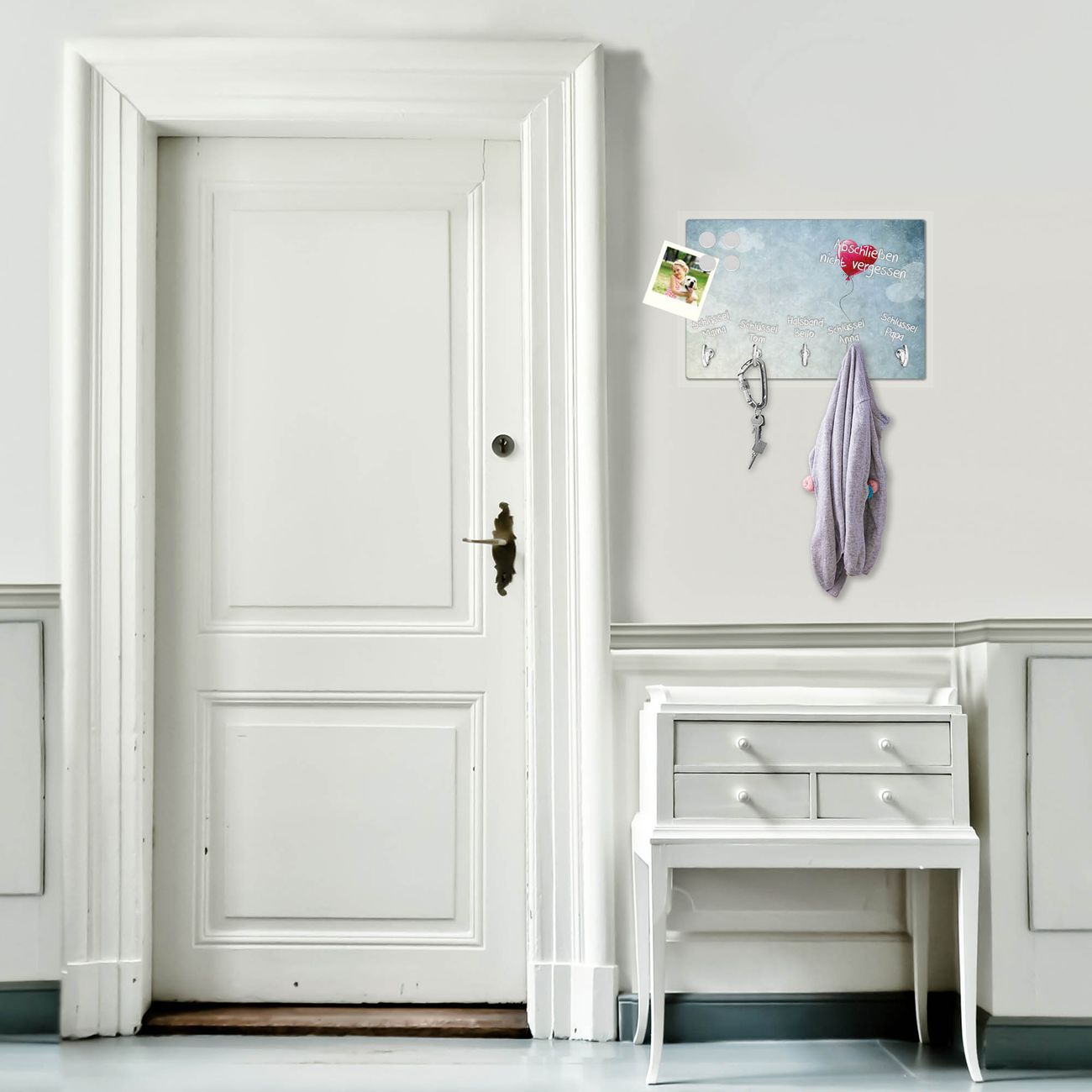 FUNKTION: Mit dem banjado Schlüsselbrett Herzballon hat Ihre Suche nach dem Schlüsselbund endlich ein Ende! Auf gesamt 5 Haken finden auch die größten Schlüssel ihren Platz. Durch den farbenfrohen Motivdruck ist das Schlüsselboard ein Blickfang in jeder Wohnung. DESIGN: Die Schlüsselleiste mit Motiv Herzballon hat ein sehr ansprechendes und ausgefallenes Design. Das Glasboard besteht aus einer gehärteten Glasscheibe mit dem Motiv Ihrer Wahl. Ihre neue Schlüsselaufbewahrung ist funktionell und ein optisches Highlight. DETAILS: Das Schlüsselbrett ist 30 x 20 x 4,5 CM (BxHxT). Das ganze Board besteht aus gehärtetem Sicherheitsglas, die Haken zur Selbstmontage präsentieren sich in Edelstahl-Optik. Für einen sicheren Halt erfolgt die Aufhängung an 2 vorgefertigten Haltern an der Rückseite. Das Montagematerial fügen wir bei. NUTZEN: Hier findet alles seinen Platz: Schlüsselbunde, Geschirrtücher, Hundeleinen oder Kinderjacken. Das Glas kann mit Kreidestiften bzw. Whiteboard-Marker beschrieben werden, mit extrastarken Neodym-Magneten können Sie auch Notizen anheften. BANJADO: Wir sind ein kleines Team aus dem Herzen von Sachsen und fertigen Ihre neue Schlüsselaufbewahrung von Hand an. Sie erhalten Handarbeit und keine preiswerte Importware. Wir hoffen, dass Ihnen unsere Idee zusagt, herzlichst das banjado Team.