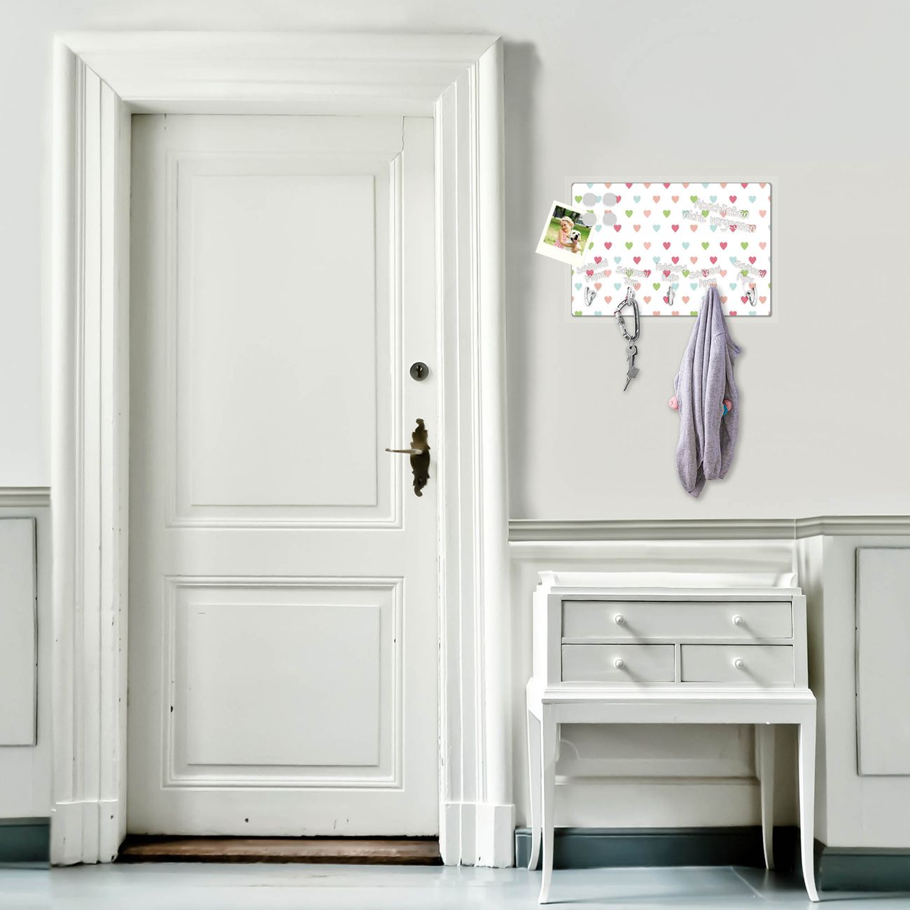 FUNKTION: Mit dem banjado Schlüsselbrett Herzen Auf Weiß hat Ihre Suche nach dem Schlüsselbund endlich ein Ende! Auf gesamt 5 Haken finden auch die größten Schlüssel ihren Platz. Durch den farbenfrohen Motivdruck ist das Schlüsselboard ein Blickfang in jeder Wohnung. DESIGN: Die Schlüsselleiste mit Motiv Herzen Auf Weiß hat ein sehr ansprechendes und ausgefallenes Design. Das Glasboard besteht aus einer gehärteten Glasscheibe mit dem Motiv Ihrer Wahl. Ihre neue Schlüsselaufbewahrung ist funktionell und ein optisches Highlight. DETAILS: Das Schlüsselbrett ist 30 x 20 x 4,5 CM (BxHxT). Das ganze Board besteht aus gehärtetem Sicherheitsglas, die Haken zur Selbstmontage präsentieren sich in Edelstahl-Optik. Für einen sicheren Halt erfolgt die Aufhängung an 2 vorgefertigten Haltern an der Rückseite. Das Montagematerial fügen wir bei. NUTZEN: Hier findet alles seinen Platz: Schlüsselbunde, Geschirrtücher, Hundeleinen oder Kinderjacken. Das Glas kann mit Kreidestiften bzw. Whiteboard-Marker beschrieben werden, mit extrastarken Neodym-Magneten können Sie auch Notizen anheften. BANJADO: Wir sind ein kleines Team aus dem Herzen von Sachsen und fertigen Ihre neue Schlüsselaufbewahrung von Hand an. Sie erhalten Handarbeit und keine preiswerte Importware. Wir hoffen, dass Ihnen unsere Idee zusagt, herzlichst das banjado Team.