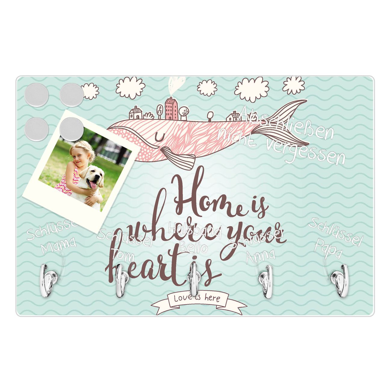 FUNKTION: Mit dem banjado Schlüsselbrett Herzensangelegenheit hat Ihre Suche nach dem Schlüsselbund endlich ein Ende! Auf gesamt 5 Haken finden auch die größten Schlüssel ihren Platz. Durch den farbenfrohen Motivdruck ist das Schlüsselboard ein Blickfang in jeder Wohnung. DESIGN: Die Schlüsselleiste mit Motiv Herzensangelegenheit hat ein sehr ansprechendes und ausgefallenes Design. Das Glasboard besteht aus einer gehärteten Glasscheibe mit dem Motiv Ihrer Wahl. Ihre neue Schlüsselaufbewahrung ist funktionell und ein optisches Highlight. DETAILS: Das Schlüsselbrett ist 30 x 20 x 4,5 CM (BxHxT). Das ganze Board besteht aus gehärtetem Sicherheitsglas, die Haken zur Selbstmontage präsentieren sich in Edelstahl-Optik. Für einen sicheren Halt erfolgt die Aufhängung an 2 vorgefertigten Haltern an der Rückseite. Das Montagematerial fügen wir bei. NUTZEN: Hier findet alles seinen Platz: Schlüsselbunde, Geschirrtücher, Hundeleinen oder Kinderjacken. Das Glas kann mit Kreidestiften bzw. Whiteboard-Marker beschrieben werden, mit extrastarken Neodym-Magneten können Sie auch Notizen anheften. BANJADO: Wir sind ein kleines Team aus dem Herzen von Sachsen und fertigen Ihre neue Schlüsselaufbewahrung von Hand an. Sie erhalten Handarbeit und keine preiswerte Importware. Wir hoffen, dass Ihnen unsere Idee zusagt, herzlichst das banjado Team.