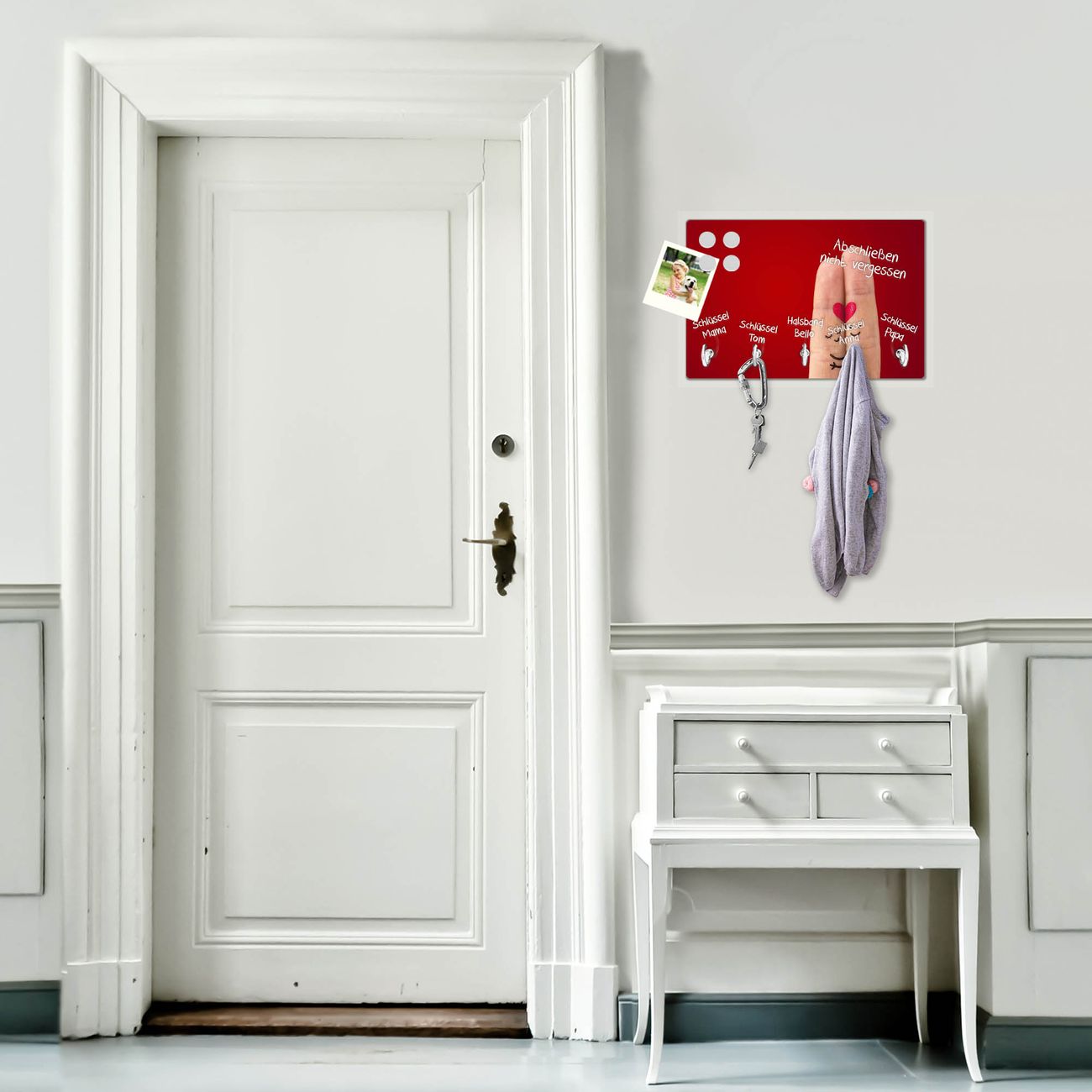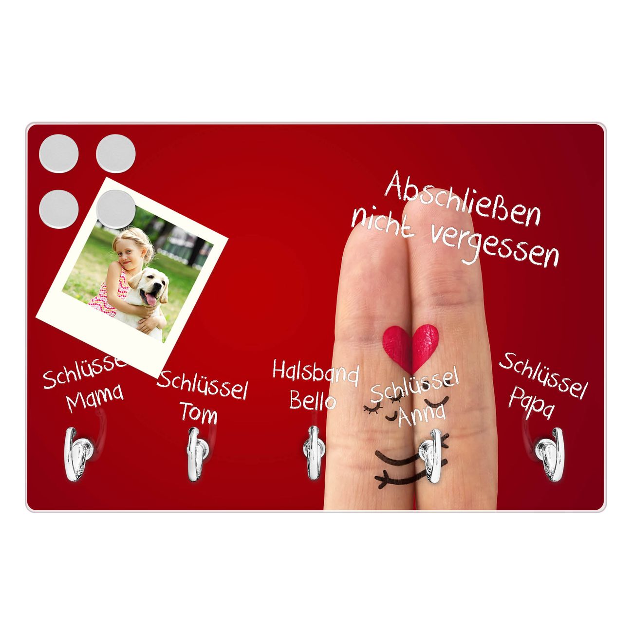 FUNKTION: Mit dem banjado Schlüsselbrett Hold Me Tight hat Ihre Suche nach dem Schlüsselbund endlich ein Ende! Auf gesamt 5 Haken finden auch die größten Schlüssel ihren Platz. Durch den farbenfrohen Motivdruck ist das Schlüsselboard ein Blickfang in jeder Wohnung. DESIGN: Die Schlüsselleiste mit Motiv Hold Me Tight hat ein sehr ansprechendes und ausgefallenes Design. Das Glasboard besteht aus einer gehärteten Glasscheibe mit dem Motiv Ihrer Wahl. Ihre neue Schlüsselaufbewahrung ist funktionell und ein optisches Highlight. DETAILS: Das Schlüsselbrett ist 30 x 20 x 4,5 CM (BxHxT). Das ganze Board besteht aus gehärtetem Sicherheitsglas, die Haken zur Selbstmontage präsentieren sich in Edelstahl-Optik. Für einen sicheren Halt erfolgt die Aufhängung an 2 vorgefertigten Haltern an der Rückseite. Das Montagematerial fügen wir bei. NUTZEN: Hier findet alles seinen Platz: Schlüsselbunde, Geschirrtücher, Hundeleinen oder Kinderjacken. Das Glas kann mit Kreidestiften bzw. Whiteboard-Marker beschrieben werden, mit extrastarken Neodym-Magneten können Sie auch Notizen anheften. BANJADO: Wir sind ein kleines Team aus dem Herzen von Sachsen und fertigen Ihre neue Schlüsselaufbewahrung von Hand an. Sie erhalten Handarbeit und keine preiswerte Importware. Wir hoffen, dass Ihnen unsere Idee zusagt, herzlichst das banjado Team.