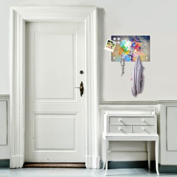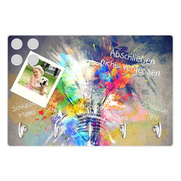 FUNKTION: Mit dem banjado Schlüsselbrett Idee hat Ihre Suche nach dem Schlüsselbund endlich ein Ende! Auf gesamt 5 Haken finden auch die größten Schlüssel ihren Platz. Durch den farbenfrohen Motivdruck ist das Schlüsselboard ein Blickfang in jeder Wohnung. DESIGN: Die Schlüsselleiste mit Motiv Idee hat ein sehr ansprechendes und ausgefallenes Design. Das Glasboard besteht aus einer gehärteten Glasscheibe mit dem Motiv Ihrer Wahl. Ihre neue Schlüsselaufbewahrung ist funktionell und ein optisches Highlight. DETAILS: Das Schlüsselbrett ist 30 x 20 x 4,5 CM (BxHxT). Das ganze Board besteht aus gehärtetem Sicherheitsglas, die Haken zur Selbstmontage präsentieren sich in Edelstahl-Optik. Für einen sicheren Halt erfolgt die Aufhängung an 2 vorgefertigten Haltern an der Rückseite. Das Montagematerial fügen wir bei. NUTZEN: Hier findet alles seinen Platz: Schlüsselbunde, Geschirrtücher, Hundeleinen oder Kinderjacken. Das Glas kann mit Kreidestiften bzw. Whiteboard-Marker beschrieben werden, mit extrastarken Neodym-Magneten können Sie auch Notizen anheften. BANJADO: Wir sind ein kleines Team aus dem Herzen von Sachsen und fertigen Ihre neue Schlüsselaufbewahrung von Hand an. Sie erhalten Handarbeit und keine preiswerte Importware. Wir hoffen, dass Ihnen unsere Idee zusagt, herzlichst das banjado Team.