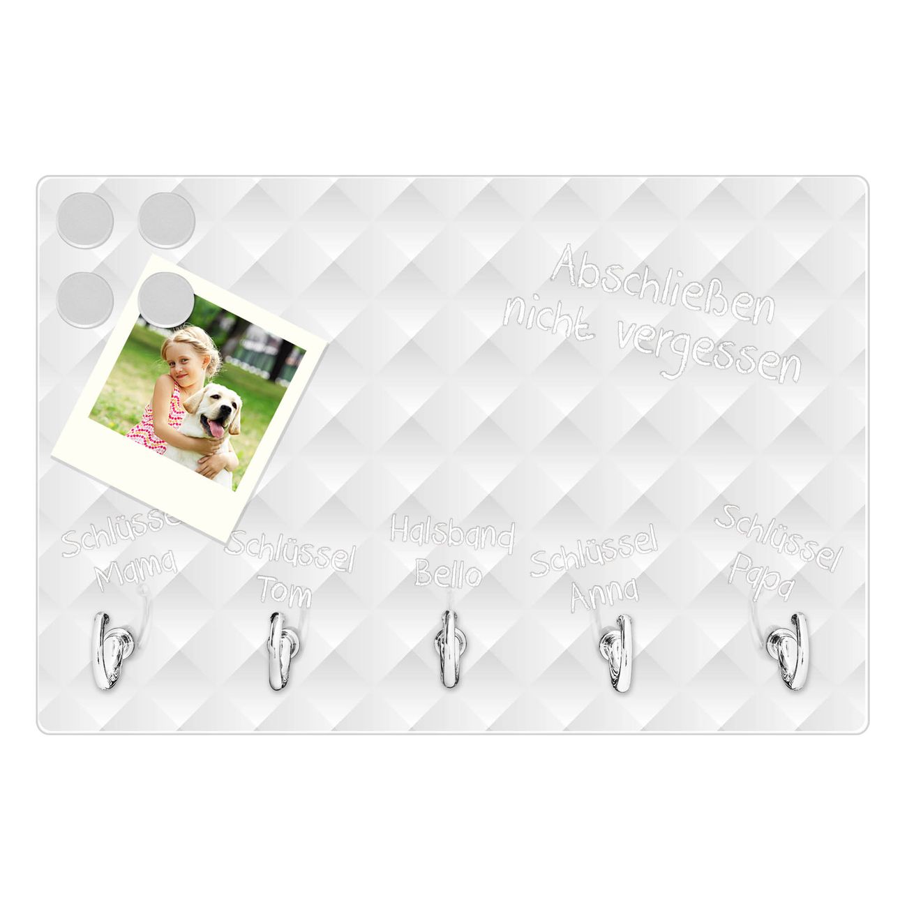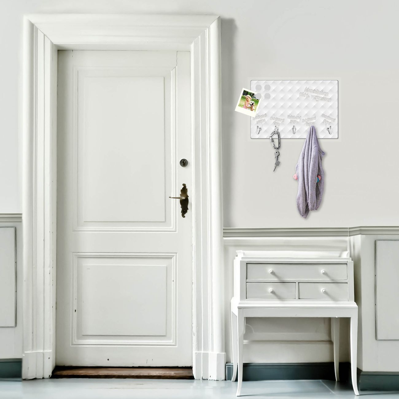 FUNKTION: Mit dem banjado Schlüsselbrett In Out hat Ihre Suche nach dem Schlüsselbund endlich ein Ende! Auf gesamt 5 Haken finden auch die größten Schlüssel ihren Platz. Durch den farbenfrohen Motivdruck ist das Schlüsselboard ein Blickfang in jeder Wohnung. DESIGN: Die Schlüsselleiste mit Motiv In Out hat ein sehr ansprechendes und ausgefallenes Design. Das Glasboard besteht aus einer gehärteten Glasscheibe mit dem Motiv Ihrer Wahl. Ihre neue Schlüsselaufbewahrung ist funktionell und ein optisches Highlight. DETAILS: Das Schlüsselbrett ist 30 x 20 x 4,5 CM (BxHxT). Das ganze Board besteht aus gehärtetem Sicherheitsglas, die Haken zur Selbstmontage präsentieren sich in Edelstahl-Optik. Für einen sicheren Halt erfolgt die Aufhängung an 2 vorgefertigten Haltern an der Rückseite. Das Montagematerial fügen wir bei. NUTZEN: Hier findet alles seinen Platz: Schlüsselbunde, Geschirrtücher, Hundeleinen oder Kinderjacken. Das Glas kann mit Kreidestiften bzw. Whiteboard-Marker beschrieben werden, mit extrastarken Neodym-Magneten können Sie auch Notizen anheften. BANJADO: Wir sind ein kleines Team aus dem Herzen von Sachsen und fertigen Ihre neue Schlüsselaufbewahrung von Hand an. Sie erhalten Handarbeit und keine preiswerte Importware. Wir hoffen, dass Ihnen unsere Idee zusagt, herzlichst das banjado Team.