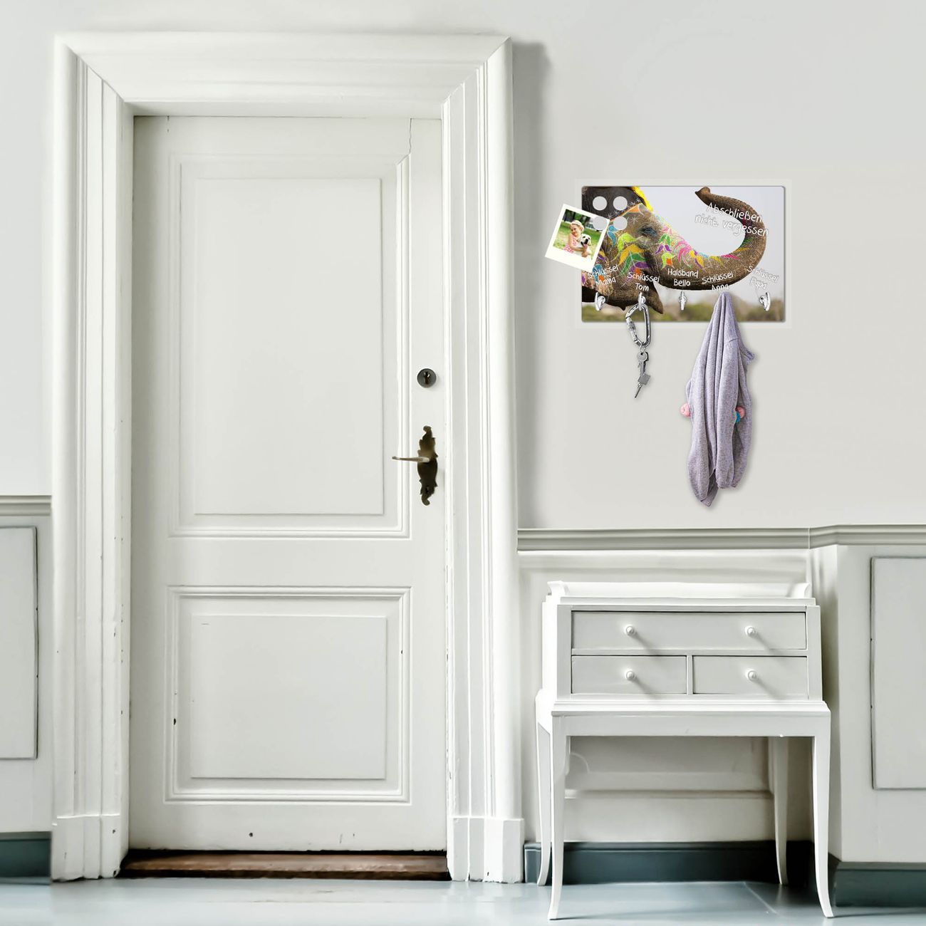 FUNKTION: Mit dem banjado Schlüsselbrett Indischer Elephant hat Ihre Suche nach dem Schlüsselbund endlich ein Ende! Auf gesamt 5 Haken finden auch die größten Schlüssel ihren Platz. Durch den farbenfrohen Motivdruck ist das Schlüsselboard ein Blickfang in jeder Wohnung. DESIGN: Die Schlüsselleiste mit Motiv Indischer Elephant hat ein sehr ansprechendes und ausgefallenes Design. Das Glasboard besteht aus einer gehärteten Glasscheibe mit dem Motiv Ihrer Wahl. Ihre neue Schlüsselaufbewahrung ist funktionell und ein optisches Highlight. DETAILS: Das Schlüsselbrett ist 30 x 20 x 4,5 CM (BxHxT). Das ganze Board besteht aus gehärtetem Sicherheitsglas, die Haken zur Selbstmontage präsentieren sich in Edelstahl-Optik. Für einen sicheren Halt erfolgt die Aufhängung an 2 vorgefertigten Haltern an der Rückseite. Das Montagematerial fügen wir bei. NUTZEN: Hier findet alles seinen Platz: Schlüsselbunde, Geschirrtücher, Hundeleinen oder Kinderjacken. Das Glas kann mit Kreidestiften bzw. Whiteboard-Marker beschrieben werden, mit extrastarken Neodym-Magneten können Sie auch Notizen anheften. BANJADO: Wir sind ein kleines Team aus dem Herzen von Sachsen und fertigen Ihre neue Schlüsselaufbewahrung von Hand an. Sie erhalten Handarbeit und keine preiswerte Importware. Wir hoffen, dass Ihnen unsere Idee zusagt, herzlichst das banjado Team.