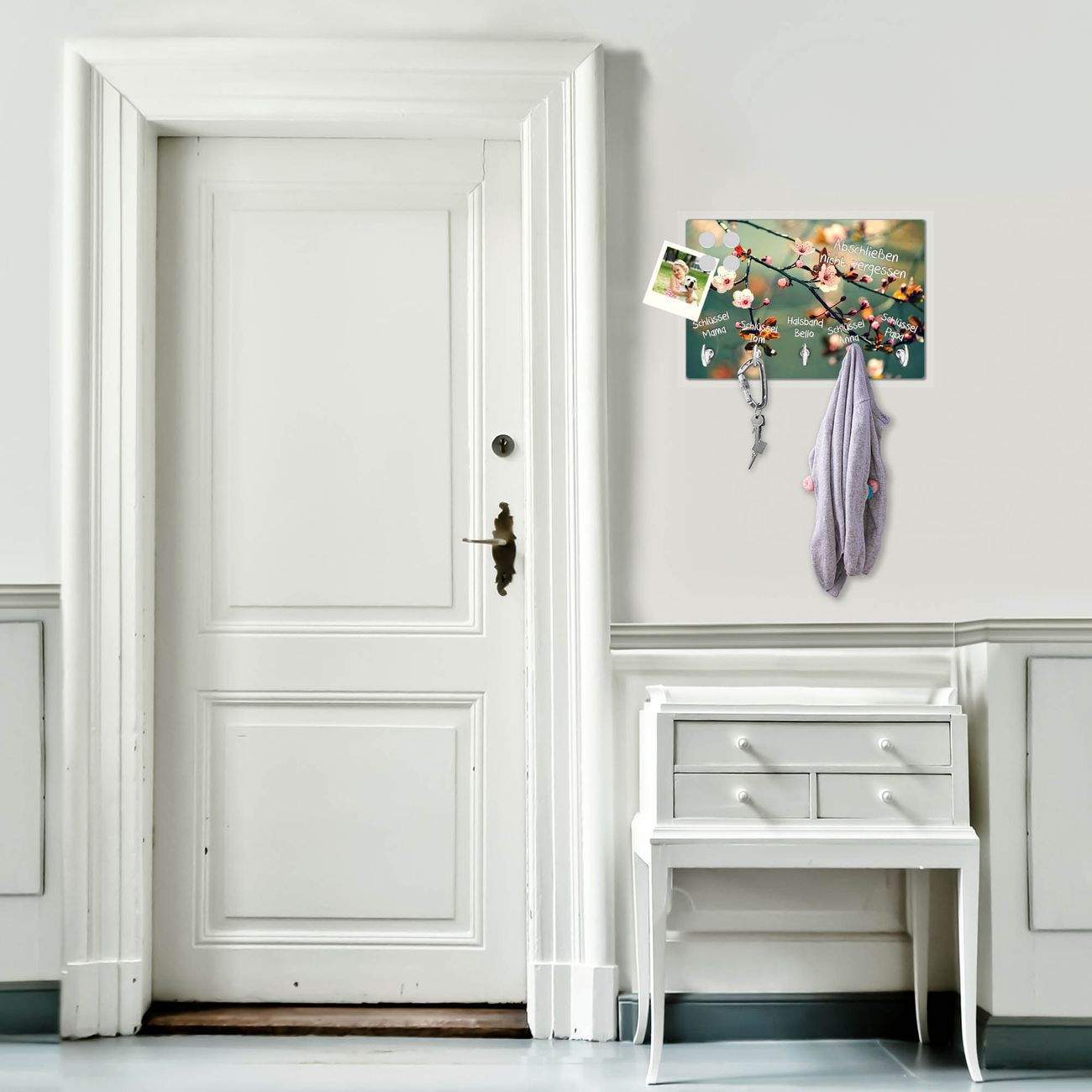 FUNKTION: Mit dem banjado Schlüsselbrett Japankirsche hat Ihre Suche nach dem Schlüsselbund endlich ein Ende! Auf gesamt 5 Haken finden auch die größten Schlüssel ihren Platz. Durch den farbenfrohen Motivdruck ist das Schlüsselboard ein Blickfang in jeder Wohnung. DESIGN: Die Schlüsselleiste mit Motiv Japankirsche hat ein sehr ansprechendes und ausgefallenes Design. Das Glasboard besteht aus einer gehärteten Glasscheibe mit dem Motiv Ihrer Wahl. Ihre neue Schlüsselaufbewahrung ist funktionell und ein optisches Highlight. DETAILS: Das Schlüsselbrett ist 30 x 20 x 4,5 CM (BxHxT). Das ganze Board besteht aus gehärtetem Sicherheitsglas, die Haken zur Selbstmontage präsentieren sich in Edelstahl-Optik. Für einen sicheren Halt erfolgt die Aufhängung an 2 vorgefertigten Haltern an der Rückseite. Das Montagematerial fügen wir bei. NUTZEN: Hier findet alles seinen Platz: Schlüsselbunde, Geschirrtücher, Hundeleinen oder Kinderjacken. Das Glas kann mit Kreidestiften bzw. Whiteboard-Marker beschrieben werden, mit extrastarken Neodym-Magneten können Sie auch Notizen anheften. BANJADO: Wir sind ein kleines Team aus dem Herzen von Sachsen und fertigen Ihre neue Schlüsselaufbewahrung von Hand an. Sie erhalten Handarbeit und keine preiswerte Importware. Wir hoffen, dass Ihnen unsere Idee zusagt, herzlichst das banjado Team.