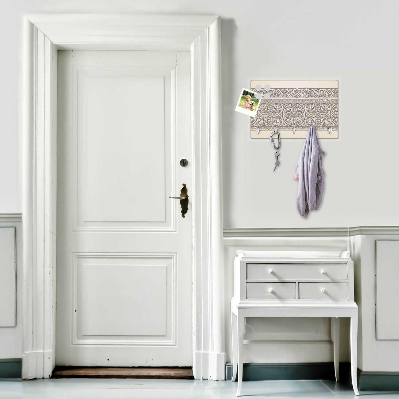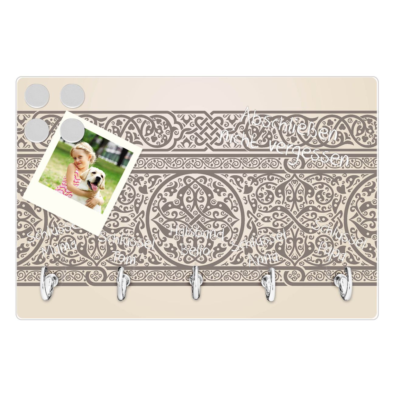 FUNKTION: Mit dem banjado Schlüsselbrett Keltischer Knoten hat Ihre Suche nach dem Schlüsselbund endlich ein Ende! Auf gesamt 5 Haken finden auch die größten Schlüssel ihren Platz. Durch den farbenfrohen Motivdruck ist das Schlüsselboard ein Blickfang in jeder Wohnung. DESIGN: Die Schlüsselleiste mit Motiv Keltischer Knoten hat ein sehr ansprechendes und ausgefallenes Design. Das Glasboard besteht aus einer gehärteten Glasscheibe mit dem Motiv Ihrer Wahl. Ihre neue Schlüsselaufbewahrung ist funktionell und ein optisches Highlight. DETAILS: Das Schlüsselbrett ist 30 x 20 x 4,5 CM (BxHxT). Das ganze Board besteht aus gehärtetem Sicherheitsglas, die Haken zur Selbstmontage präsentieren sich in Edelstahl-Optik. Für einen sicheren Halt erfolgt die Aufhängung an 2 vorgefertigten Haltern an der Rückseite. Das Montagematerial fügen wir bei. NUTZEN: Hier findet alles seinen Platz: Schlüsselbunde, Geschirrtücher, Hundeleinen oder Kinderjacken. Das Glas kann mit Kreidestiften bzw. Whiteboard-Marker beschrieben werden, mit extrastarken Neodym-Magneten können Sie auch Notizen anheften. BANJADO: Wir sind ein kleines Team aus dem Herzen von Sachsen und fertigen Ihre neue Schlüsselaufbewahrung von Hand an. Sie erhalten Handarbeit und keine preiswerte Importware. Wir hoffen, dass Ihnen unsere Idee zusagt, herzlichst das banjado Team.