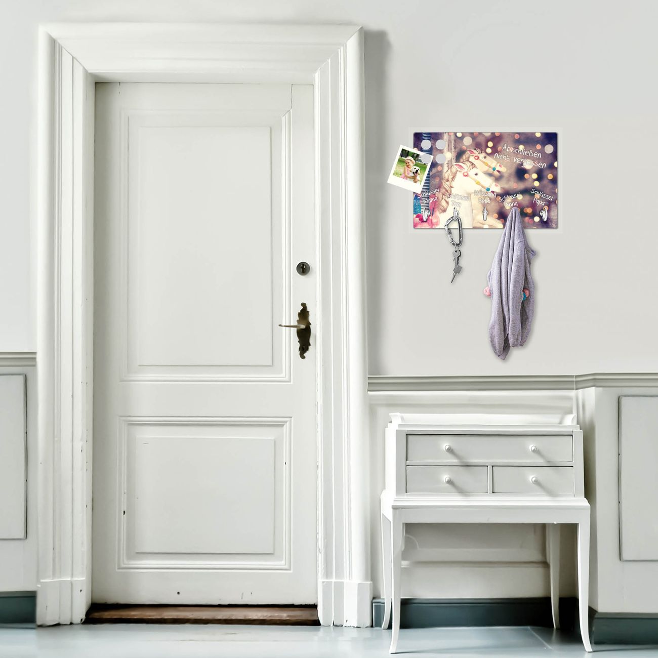 FUNKTION: Mit dem banjado Schlüsselbrett Kinderkarussell hat Ihre Suche nach dem Schlüsselbund endlich ein Ende! Auf gesamt 5 Haken finden auch die größten Schlüssel ihren Platz. Durch den farbenfrohen Motivdruck ist das Schlüsselboard ein Blickfang in jeder Wohnung. DESIGN: Die Schlüsselleiste mit Motiv Kinderkarussell hat ein sehr ansprechendes und ausgefallenes Design. Das Glasboard besteht aus einer gehärteten Glasscheibe mit dem Motiv Ihrer Wahl. Ihre neue Schlüsselaufbewahrung ist funktionell und ein optisches Highlight. DETAILS: Das Schlüsselbrett ist 30 x 20 x 4,5 CM (BxHxT). Das ganze Board besteht aus gehärtetem Sicherheitsglas, die Haken zur Selbstmontage präsentieren sich in Edelstahl-Optik. Für einen sicheren Halt erfolgt die Aufhängung an 2 vorgefertigten Haltern an der Rückseite. Das Montagematerial fügen wir bei. NUTZEN: Hier findet alles seinen Platz: Schlüsselbunde, Geschirrtücher, Hundeleinen oder Kinderjacken. Das Glas kann mit Kreidestiften bzw. Whiteboard-Marker beschrieben werden, mit extrastarken Neodym-Magneten können Sie auch Notizen anheften. BANJADO: Wir sind ein kleines Team aus dem Herzen von Sachsen und fertigen Ihre neue Schlüsselaufbewahrung von Hand an. Sie erhalten Handarbeit und keine preiswerte Importware. Wir hoffen, dass Ihnen unsere Idee zusagt, herzlichst das banjado Team.