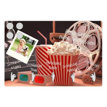 FUNKTION: Mit dem banjado Schlüsselbrett Kino hat Ihre Suche nach dem Schlüsselbund endlich ein Ende! Auf gesamt 5 Haken finden auch die größten Schlüssel ihren Platz. Durch den farbenfrohen Motivdruck ist das Schlüsselboard ein Blickfang in jeder Wohnung. DESIGN: Die Schlüsselleiste mit Motiv Kino hat ein sehr ansprechendes und ausgefallenes Design. Das Glasboard besteht aus einer gehärteten Glasscheibe mit dem Motiv Ihrer Wahl. Ihre neue Schlüsselaufbewahrung ist funktionell und ein optisches Highlight. DETAILS: Das Schlüsselbrett ist 30 x 20 x 4,5 CM (BxHxT). Das ganze Board besteht aus gehärtetem Sicherheitsglas, die Haken zur Selbstmontage präsentieren sich in Edelstahl-Optik. Für einen sicheren Halt erfolgt die Aufhängung an 2 vorgefertigten Haltern an der Rückseite. Das Montagematerial fügen wir bei. NUTZEN: Hier findet alles seinen Platz: Schlüsselbunde, Geschirrtücher, Hundeleinen oder Kinderjacken. Das Glas kann mit Kreidestiften bzw. Whiteboard-Marker beschrieben werden, mit extrastarken Neodym-Magneten können Sie auch Notizen anheften. BANJADO: Wir sind ein kleines Team aus dem Herzen von Sachsen und fertigen Ihre neue Schlüsselaufbewahrung von Hand an. Sie erhalten Handarbeit und keine preiswerte Importware. Wir hoffen, dass Ihnen unsere Idee zusagt, herzlichst das banjado Team.