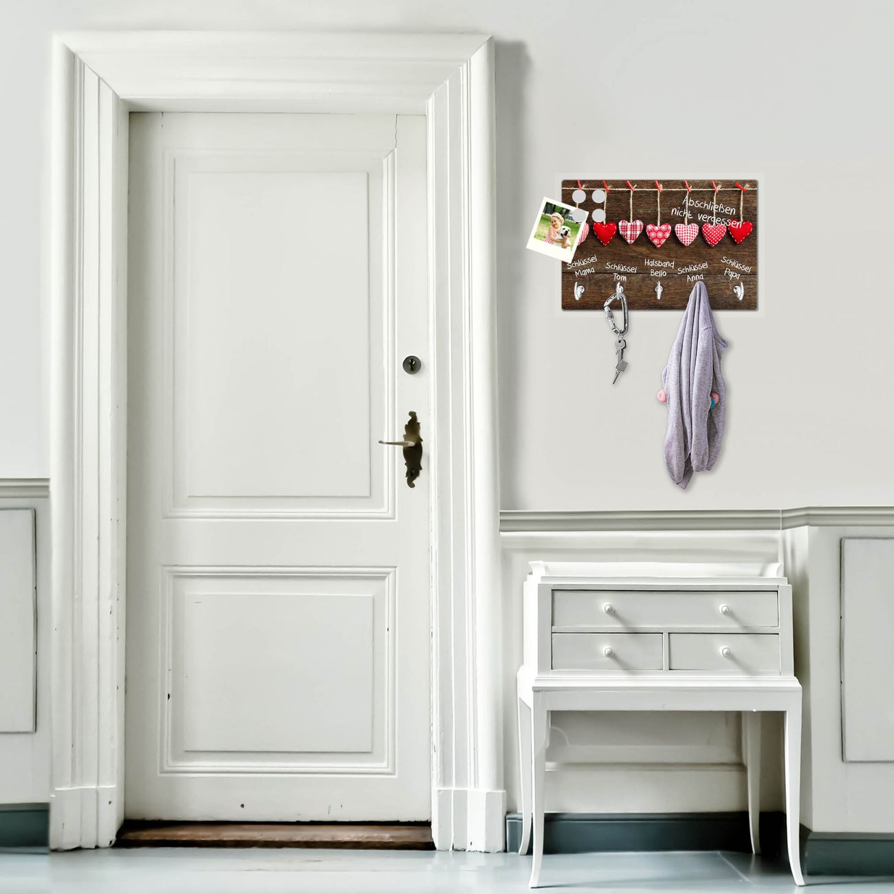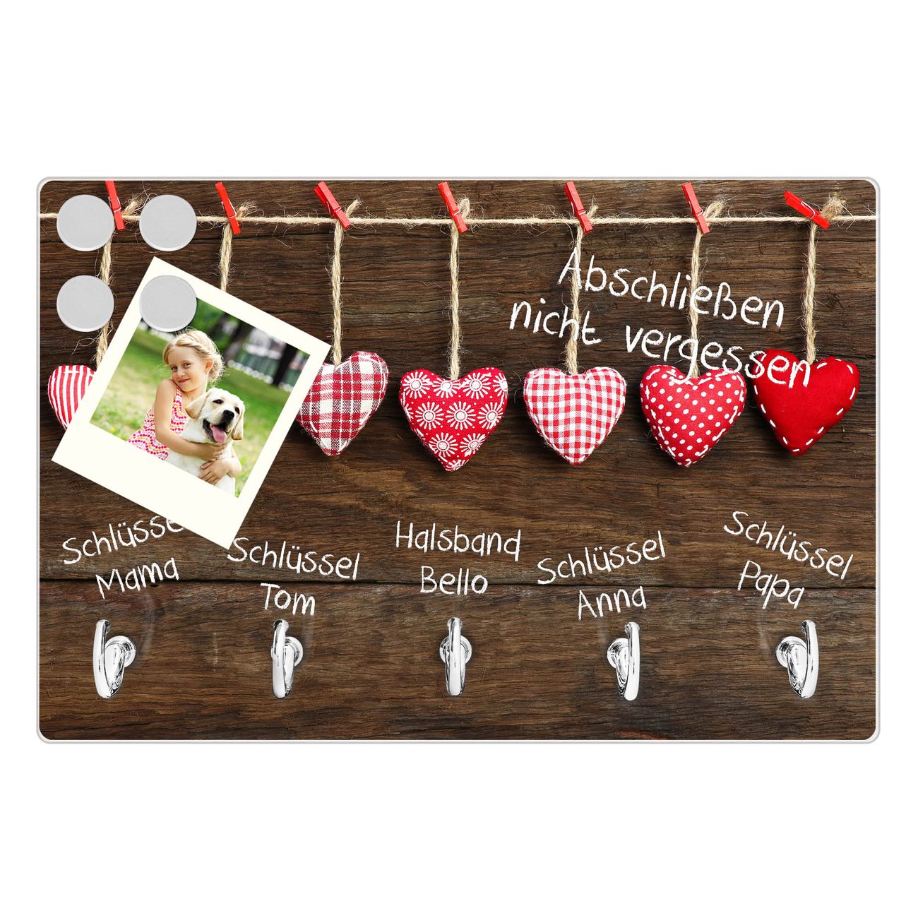 FUNKTION: Mit dem banjado Schlüsselbrett Kleine Herzen hat Ihre Suche nach dem Schlüsselbund endlich ein Ende! Auf gesamt 5 Haken finden auch die größten Schlüssel ihren Platz. Durch den farbenfrohen Motivdruck ist das Schlüsselboard ein Blickfang in jeder Wohnung. DESIGN: Die Schlüsselleiste mit Motiv Kleine Herzen hat ein sehr ansprechendes und ausgefallenes Design. Das Glasboard besteht aus einer gehärteten Glasscheibe mit dem Motiv Ihrer Wahl. Ihre neue Schlüsselaufbewahrung ist funktionell und ein optisches Highlight. DETAILS: Das Schlüsselbrett ist 30 x 20 x 4,5 CM (BxHxT). Das ganze Board besteht aus gehärtetem Sicherheitsglas, die Haken zur Selbstmontage präsentieren sich in Edelstahl-Optik. Für einen sicheren Halt erfolgt die Aufhängung an 2 vorgefertigten Haltern an der Rückseite. Das Montagematerial fügen wir bei. NUTZEN: Hier findet alles seinen Platz: Schlüsselbunde, Geschirrtücher, Hundeleinen oder Kinderjacken. Das Glas kann mit Kreidestiften bzw. Whiteboard-Marker beschrieben werden, mit extrastarken Neodym-Magneten können Sie auch Notizen anheften. BANJADO: Wir sind ein kleines Team aus dem Herzen von Sachsen und fertigen Ihre neue Schlüsselaufbewahrung von Hand an. Sie erhalten Handarbeit und keine preiswerte Importware. Wir hoffen, dass Ihnen unsere Idee zusagt, herzlichst das banjado Team.