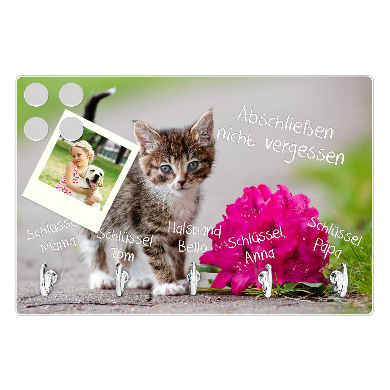 FUNKTION: Mit dem banjado Schlüsselbrett Knut hat Ihre Suche nach dem Schlüsselbund endlich ein Ende! Auf gesamt 5 Haken finden auch die größten Schlüssel ihren Platz. Durch den farbenfrohen Motivdruck ist das Schlüsselboard ein Blickfang in jeder Wohnung. DESIGN: Die Schlüsselleiste mit Motiv Knut hat ein sehr ansprechendes und ausgefallenes Design. Das Glasboard besteht aus einer gehärteten Glasscheibe mit dem Motiv Ihrer Wahl. Ihre neue Schlüsselaufbewahrung ist funktionell und ein optisches Highlight. DETAILS: Das Schlüsselbrett ist 30 x 20 x 4,5 CM (BxHxT). Das ganze Board besteht aus gehärtetem Sicherheitsglas, die Haken zur Selbstmontage präsentieren sich in Edelstahl-Optik. Für einen sicheren Halt erfolgt die Aufhängung an 2 vorgefertigten Haltern an der Rückseite. Das Montagematerial fügen wir bei. NUTZEN: Hier findet alles seinen Platz: Schlüsselbunde, Geschirrtücher, Hundeleinen oder Kinderjacken. Das Glas kann mit Kreidestiften bzw. Whiteboard-Marker beschrieben werden, mit extrastarken Neodym-Magneten können Sie auch Notizen anheften. BANJADO: Wir sind ein kleines Team aus dem Herzen von Sachsen und fertigen Ihre neue Schlüsselaufbewahrung von Hand an. Sie erhalten Handarbeit und keine preiswerte Importware. Wir hoffen, dass Ihnen unsere Idee zusagt, herzlichst das banjado Team.