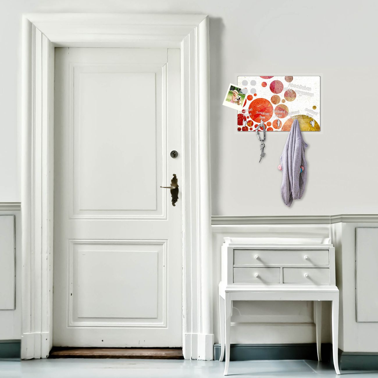 FUNKTION: Mit dem banjado Schlüsselbrett Kreise hat Ihre Suche nach dem Schlüsselbund endlich ein Ende! Auf gesamt 5 Haken finden auch die größten Schlüssel ihren Platz. Durch den farbenfrohen Motivdruck ist das Schlüsselboard ein Blickfang in jeder Wohnung. DESIGN: Die Schlüsselleiste mit Motiv Kreise hat ein sehr ansprechendes und ausgefallenes Design. Das Glasboard besteht aus einer gehärteten Glasscheibe mit dem Motiv Ihrer Wahl. Ihre neue Schlüsselaufbewahrung ist funktionell und ein optisches Highlight. DETAILS: Das Schlüsselbrett ist 30 x 20 x 4,5 CM (BxHxT). Das ganze Board besteht aus gehärtetem Sicherheitsglas, die Haken zur Selbstmontage präsentieren sich in Edelstahl-Optik. Für einen sicheren Halt erfolgt die Aufhängung an 2 vorgefertigten Haltern an der Rückseite. Das Montagematerial fügen wir bei. NUTZEN: Hier findet alles seinen Platz: Schlüsselbunde, Geschirrtücher, Hundeleinen oder Kinderjacken. Das Glas kann mit Kreidestiften bzw. Whiteboard-Marker beschrieben werden, mit extrastarken Neodym-Magneten können Sie auch Notizen anheften. BANJADO: Wir sind ein kleines Team aus dem Herzen von Sachsen und fertigen Ihre neue Schlüsselaufbewahrung von Hand an. Sie erhalten Handarbeit und keine preiswerte Importware. Wir hoffen, dass Ihnen unsere Idee zusagt, herzlichst das banjado Team.