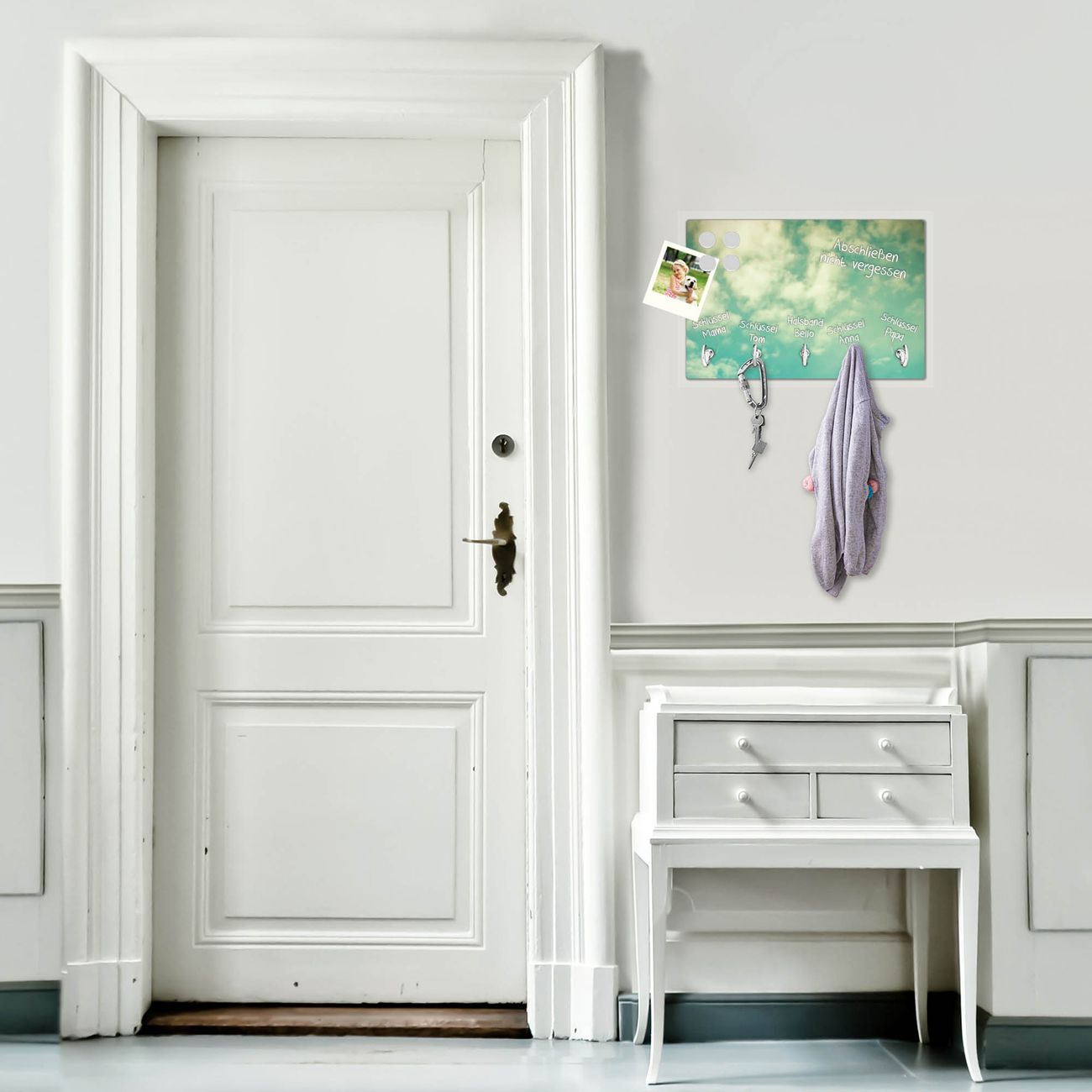 FUNKTION: Mit dem banjado Schlüsselbrett Leicht Bewölkt hat Ihre Suche nach dem Schlüsselbund endlich ein Ende! Auf gesamt 5 Haken finden auch die größten Schlüssel ihren Platz. Durch den farbenfrohen Motivdruck ist das Schlüsselboard ein Blickfang in jeder Wohnung. DESIGN: Die Schlüsselleiste mit Motiv Leicht Bewölkt hat ein sehr ansprechendes und ausgefallenes Design. Das Glasboard besteht aus einer gehärteten Glasscheibe mit dem Motiv Ihrer Wahl. Ihre neue Schlüsselaufbewahrung ist funktionell und ein optisches Highlight. DETAILS: Das Schlüsselbrett ist 30 x 20 x 4,5 CM (BxHxT). Das ganze Board besteht aus gehärtetem Sicherheitsglas, die Haken zur Selbstmontage präsentieren sich in Edelstahl-Optik. Für einen sicheren Halt erfolgt die Aufhängung an 2 vorgefertigten Haltern an der Rückseite. Das Montagematerial fügen wir bei. NUTZEN: Hier findet alles seinen Platz: Schlüsselbunde, Geschirrtücher, Hundeleinen oder Kinderjacken. Das Glas kann mit Kreidestiften bzw. Whiteboard-Marker beschrieben werden, mit extrastarken Neodym-Magneten können Sie auch Notizen anheften. BANJADO: Wir sind ein kleines Team aus dem Herzen von Sachsen und fertigen Ihre neue Schlüsselaufbewahrung von Hand an. Sie erhalten Handarbeit und keine preiswerte Importware. Wir hoffen, dass Ihnen unsere Idee zusagt, herzlichst das banjado Team.