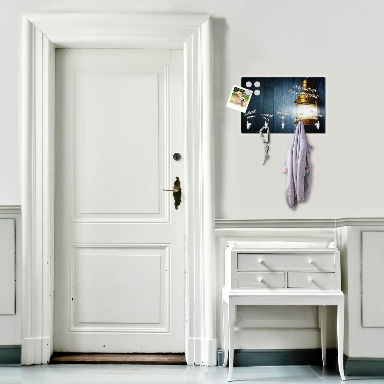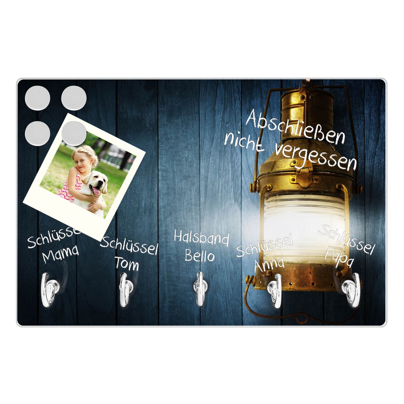 FUNKTION: Mit dem banjado Schlüsselbrett Leuchte hat Ihre Suche nach dem Schlüsselbund endlich ein Ende! Auf gesamt 5 Haken finden auch die größten Schlüssel ihren Platz. Durch den farbenfrohen Motivdruck ist das Schlüsselboard ein Blickfang in jeder Wohnung. DESIGN: Die Schlüsselleiste mit Motiv Leuchte hat ein sehr ansprechendes und ausgefallenes Design. Das Glasboard besteht aus einer gehärteten Glasscheibe mit dem Motiv Ihrer Wahl. Ihre neue Schlüsselaufbewahrung ist funktionell und ein optisches Highlight. DETAILS: Das Schlüsselbrett ist 30 x 20 x 4,5 CM (BxHxT). Das ganze Board besteht aus gehärtetem Sicherheitsglas, die Haken zur Selbstmontage präsentieren sich in Edelstahl-Optik. Für einen sicheren Halt erfolgt die Aufhängung an 2 vorgefertigten Haltern an der Rückseite. Das Montagematerial fügen wir bei. NUTZEN: Hier findet alles seinen Platz: Schlüsselbunde, Geschirrtücher, Hundeleinen oder Kinderjacken. Das Glas kann mit Kreidestiften bzw. Whiteboard-Marker beschrieben werden, mit extrastarken Neodym-Magneten können Sie auch Notizen anheften. BANJADO: Wir sind ein kleines Team aus dem Herzen von Sachsen und fertigen Ihre neue Schlüsselaufbewahrung von Hand an. Sie erhalten Handarbeit und keine preiswerte Importware. Wir hoffen, dass Ihnen unsere Idee zusagt, herzlichst das banjado Team.