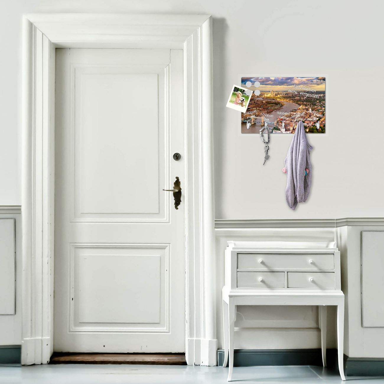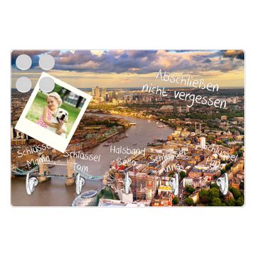 FUNKTION: Mit dem banjado Schlüsselbrett London hat Ihre Suche nach dem Schlüsselbund endlich ein Ende! Auf gesamt 5 Haken finden auch die größten Schlüssel ihren Platz. Durch den farbenfrohen Motivdruck ist das Schlüsselboard ein Blickfang in jeder Wohnung. DESIGN: Die Schlüsselleiste mit Motiv London hat ein sehr ansprechendes und ausgefallenes Design. Das Glasboard besteht aus einer gehärteten Glasscheibe mit dem Motiv Ihrer Wahl. Ihre neue Schlüsselaufbewahrung ist funktionell und ein optisches Highlight. DETAILS: Das Schlüsselbrett ist 30 x 20 x 4,5 CM (BxHxT). Das ganze Board besteht aus gehärtetem Sicherheitsglas, die Haken zur Selbstmontage präsentieren sich in Edelstahl-Optik. Für einen sicheren Halt erfolgt die Aufhängung an 2 vorgefertigten Haltern an der Rückseite. Das Montagematerial fügen wir bei. NUTZEN: Hier findet alles seinen Platz: Schlüsselbunde, Geschirrtücher, Hundeleinen oder Kinderjacken. Das Glas kann mit Kreidestiften bzw. Whiteboard-Marker beschrieben werden, mit extrastarken Neodym-Magneten können Sie auch Notizen anheften. BANJADO: Wir sind ein kleines Team aus dem Herzen von Sachsen und fertigen Ihre neue Schlüsselaufbewahrung von Hand an. Sie erhalten Handarbeit und keine preiswerte Importware. Wir hoffen, dass Ihnen unsere Idee zusagt, herzlichst das banjado Team.
