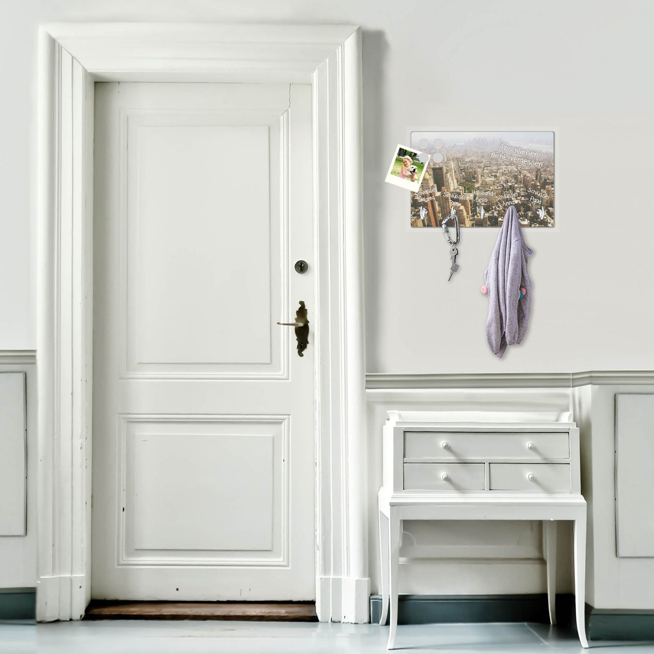 FUNKTION: Mit dem banjado Schlüsselbrett Manhattan 1 hat Ihre Suche nach dem Schlüsselbund endlich ein Ende! Auf gesamt 5 Haken finden auch die größten Schlüssel ihren Platz. Durch den farbenfrohen Motivdruck ist das Schlüsselboard ein Blickfang in jeder Wohnung. DESIGN: Die Schlüsselleiste mit Motiv Manhattan 1 hat ein sehr ansprechendes und ausgefallenes Design. Das Glasboard besteht aus einer gehärteten Glasscheibe mit dem Motiv Ihrer Wahl. Ihre neue Schlüsselaufbewahrung ist funktionell und ein optisches Highlight. DETAILS: Das Schlüsselbrett ist 30 x 20 x 4,5 CM (BxHxT). Das ganze Board besteht aus gehärtetem Sicherheitsglas, die Haken zur Selbstmontage präsentieren sich in Edelstahl-Optik. Für einen sicheren Halt erfolgt die Aufhängung an 2 vorgefertigten Haltern an der Rückseite. Das Montagematerial fügen wir bei. NUTZEN: Hier findet alles seinen Platz: Schlüsselbunde, Geschirrtücher, Hundeleinen oder Kinderjacken. Das Glas kann mit Kreidestiften bzw. Whiteboard-Marker beschrieben werden, mit extrastarken Neodym-Magneten können Sie auch Notizen anheften. BANJADO: Wir sind ein kleines Team aus dem Herzen von Sachsen und fertigen Ihre neue Schlüsselaufbewahrung von Hand an. Sie erhalten Handarbeit und keine preiswerte Importware. Wir hoffen, dass Ihnen unsere Idee zusagt, herzlichst das banjado Team.