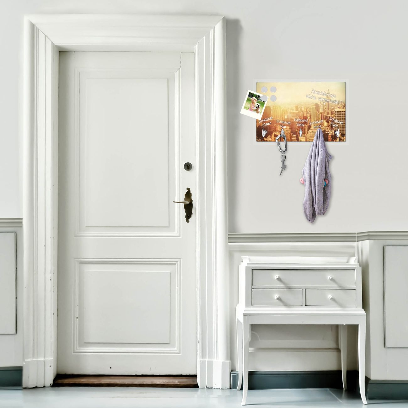 FUNKTION: Mit dem banjado Schlüsselbrett Manhattan 2 hat Ihre Suche nach dem Schlüsselbund endlich ein Ende! Auf gesamt 5 Haken finden auch die größten Schlüssel ihren Platz. Durch den farbenfrohen Motivdruck ist das Schlüsselboard ein Blickfang in jeder Wohnung. DESIGN: Die Schlüsselleiste mit Motiv Manhattan 2 hat ein sehr ansprechendes und ausgefallenes Design. Das Glasboard besteht aus einer gehärteten Glasscheibe mit dem Motiv Ihrer Wahl. Ihre neue Schlüsselaufbewahrung ist funktionell und ein optisches Highlight. DETAILS: Das Schlüsselbrett ist 30 x 20 x 4,5 CM (BxHxT). Das ganze Board besteht aus gehärtetem Sicherheitsglas, die Haken zur Selbstmontage präsentieren sich in Edelstahl-Optik. Für einen sicheren Halt erfolgt die Aufhängung an 2 vorgefertigten Haltern an der Rückseite. Das Montagematerial fügen wir bei. NUTZEN: Hier findet alles seinen Platz: Schlüsselbunde, Geschirrtücher, Hundeleinen oder Kinderjacken. Das Glas kann mit Kreidestiften bzw. Whiteboard-Marker beschrieben werden, mit extrastarken Neodym-Magneten können Sie auch Notizen anheften. BANJADO: Wir sind ein kleines Team aus dem Herzen von Sachsen und fertigen Ihre neue Schlüsselaufbewahrung von Hand an. Sie erhalten Handarbeit und keine preiswerte Importware. Wir hoffen, dass Ihnen unsere Idee zusagt, herzlichst das banjado Team.