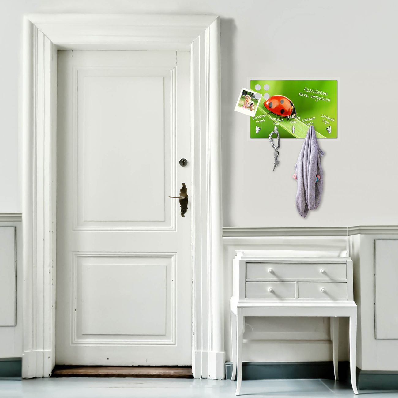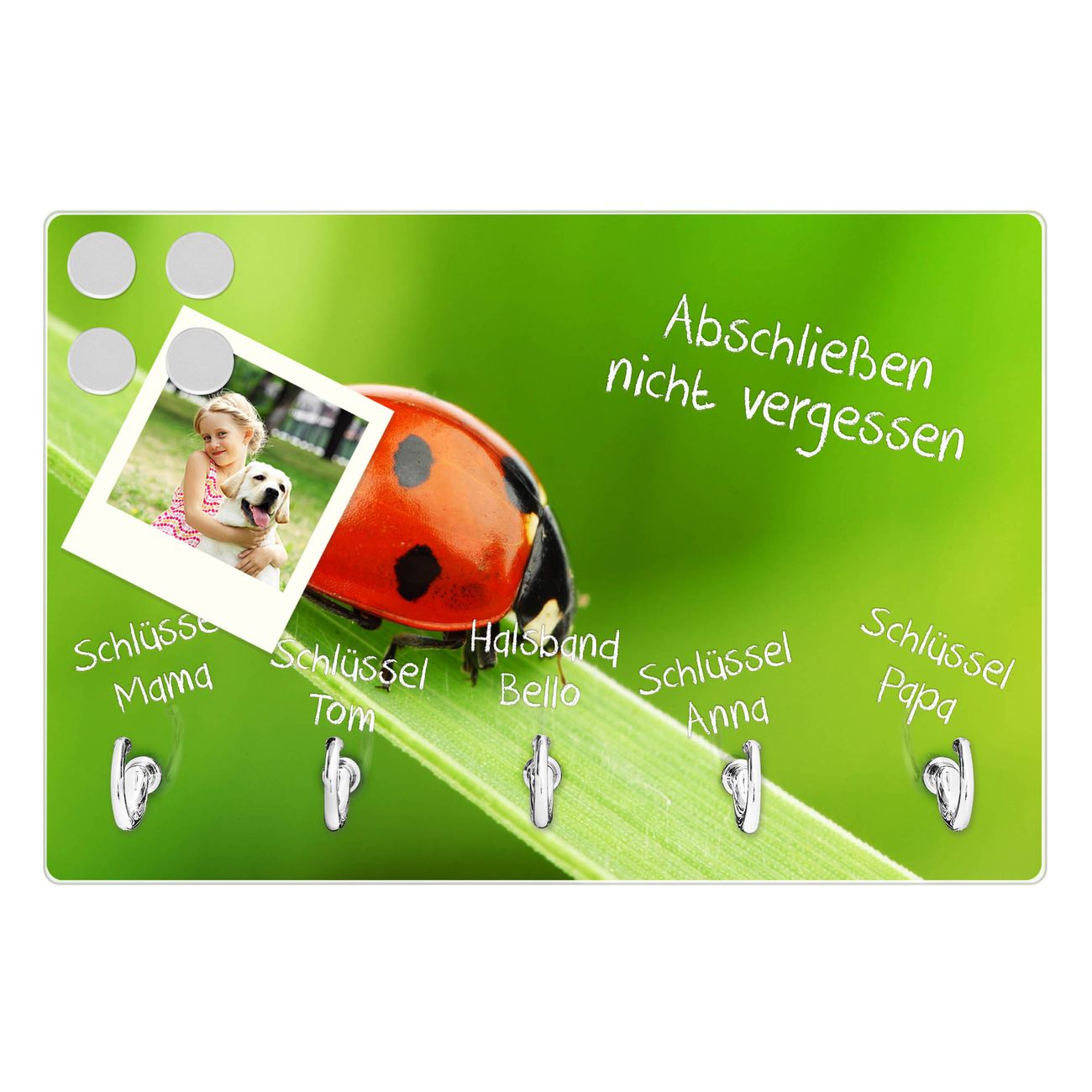 FUNKTION: Mit dem banjado Schlüsselbrett Marienkäfer hat Ihre Suche nach dem Schlüsselbund endlich ein Ende! Auf gesamt 5 Haken finden auch die größten Schlüssel ihren Platz. Durch den farbenfrohen Motivdruck ist das Schlüsselboard ein Blickfang in jeder Wohnung. DESIGN: Die Schlüsselleiste mit Motiv Marienkäfer hat ein sehr ansprechendes und ausgefallenes Design. Das Glasboard besteht aus einer gehärteten Glasscheibe mit dem Motiv Ihrer Wahl. Ihre neue Schlüsselaufbewahrung ist funktionell und ein optisches Highlight. DETAILS: Das Schlüsselbrett ist 30 x 20 x 4,5 CM (BxHxT). Das ganze Board besteht aus gehärtetem Sicherheitsglas, die Haken zur Selbstmontage präsentieren sich in Edelstahl-Optik. Für einen sicheren Halt erfolgt die Aufhängung an 2 vorgefertigten Haltern an der Rückseite. Das Montagematerial fügen wir bei. NUTZEN: Hier findet alles seinen Platz: Schlüsselbunde, Geschirrtücher, Hundeleinen oder Kinderjacken. Das Glas kann mit Kreidestiften bzw. Whiteboard-Marker beschrieben werden, mit extrastarken Neodym-Magneten können Sie auch Notizen anheften. BANJADO: Wir sind ein kleines Team aus dem Herzen von Sachsen und fertigen Ihre neue Schlüsselaufbewahrung von Hand an. Sie erhalten Handarbeit und keine preiswerte Importware. Wir hoffen, dass Ihnen unsere Idee zusagt, herzlichst das banjado Team.