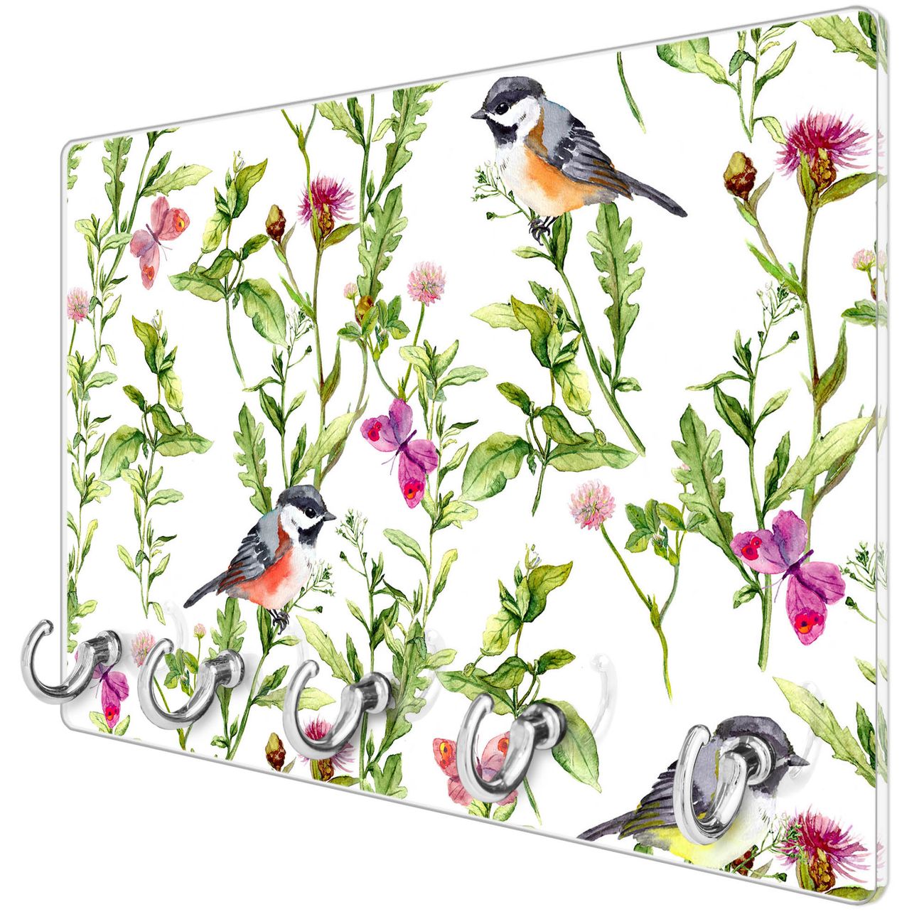 Glas Schlüsselbrett mit 5 Haken Meisen im Klee