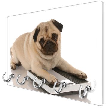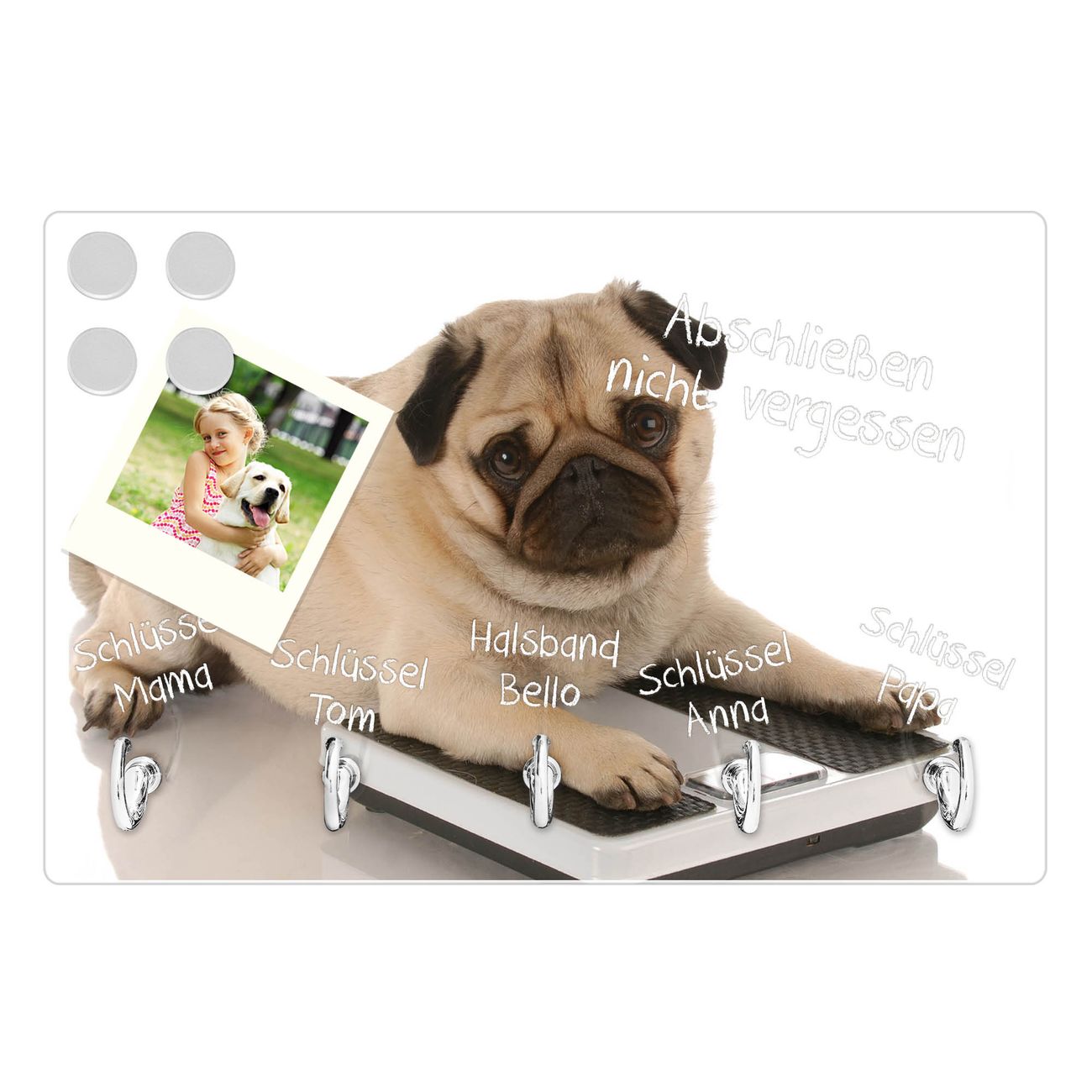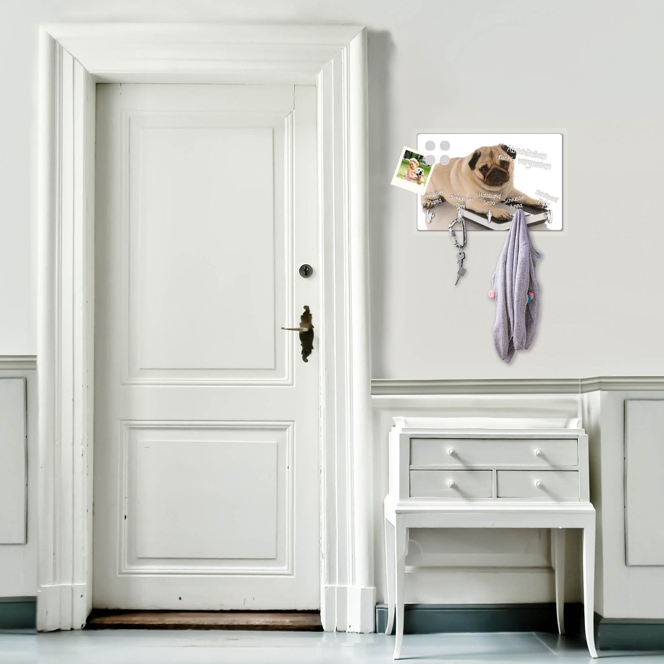 FUNKTION: Mit dem banjado Schlüsselbrett Mops hat Ihre Suche nach dem Schlüsselbund endlich ein Ende! Auf gesamt 5 Haken finden auch die größten Schlüssel ihren Platz. Durch den farbenfrohen Motivdruck ist das Schlüsselboard ein Blickfang in jeder Wohnung. DESIGN: Die Schlüsselleiste mit Motiv Mops hat ein sehr ansprechendes und ausgefallenes Design. Das Glasboard besteht aus einer gehärteten Glasscheibe mit dem Motiv Ihrer Wahl. Ihre neue Schlüsselaufbewahrung ist funktionell und ein optisches Highlight. DETAILS: Das Schlüsselbrett ist 30 x 20 x 4,5 CM (BxHxT). Das ganze Board besteht aus gehärtetem Sicherheitsglas, die Haken zur Selbstmontage präsentieren sich in Edelstahl-Optik. Für einen sicheren Halt erfolgt die Aufhängung an 2 vorgefertigten Haltern an der Rückseite. Das Montagematerial fügen wir bei. NUTZEN: Hier findet alles seinen Platz: Schlüsselbunde, Geschirrtücher, Hundeleinen oder Kinderjacken. Das Glas kann mit Kreidestiften bzw. Whiteboard-Marker beschrieben werden, mit extrastarken Neodym-Magneten können Sie auch Notizen anheften. BANJADO: Wir sind ein kleines Team aus dem Herzen von Sachsen und fertigen Ihre neue Schlüsselaufbewahrung von Hand an. Sie erhalten Handarbeit und keine preiswerte Importware. Wir hoffen, dass Ihnen unsere Idee zusagt, herzlichst das banjado Team.
