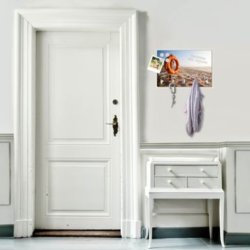 FUNKTION: Mit dem banjado Schlüsselbrett Morgens Am Strand hat Ihre Suche nach dem Schlüsselbund endlich ein Ende! Auf gesamt 5 Haken finden auch die größten Schlüssel ihren Platz. Durch den farbenfrohen Motivdruck ist das Schlüsselboard ein Blickfang in jeder Wohnung. DESIGN: Die Schlüsselleiste mit Motiv Morgens Am Strand hat ein sehr ansprechendes und ausgefallenes Design. Das Glasboard besteht aus einer gehärteten Glasscheibe mit dem Motiv Ihrer Wahl. Ihre neue Schlüsselaufbewahrung ist funktionell und ein optisches Highlight. DETAILS: Das Schlüsselbrett ist 30 x 20 x 4,5 CM (BxHxT). Das ganze Board besteht aus gehärtetem Sicherheitsglas, die Haken zur Selbstmontage präsentieren sich in Edelstahl-Optik. Für einen sicheren Halt erfolgt die Aufhängung an 2 vorgefertigten Haltern an der Rückseite. Das Montagematerial fügen wir bei. NUTZEN: Hier findet alles seinen Platz: Schlüsselbunde, Geschirrtücher, Hundeleinen oder Kinderjacken. Das Glas kann mit Kreidestiften bzw. Whiteboard-Marker beschrieben werden, mit extrastarken Neodym-Magneten können Sie auch Notizen anheften. BANJADO: Wir sind ein kleines Team aus dem Herzen von Sachsen und fertigen Ihre neue Schlüsselaufbewahrung von Hand an. Sie erhalten Handarbeit und keine preiswerte Importware. Wir hoffen, dass Ihnen unsere Idee zusagt, herzlichst das banjado Team.