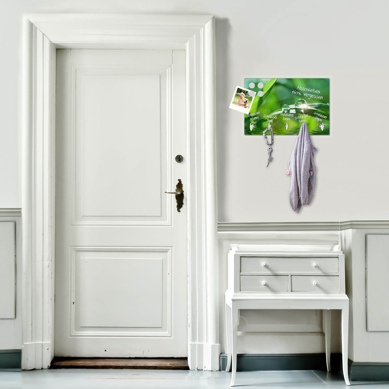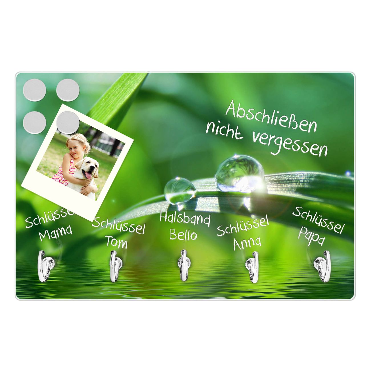 FUNKTION: Mit dem banjado Schlüsselbrett Morgentau hat Ihre Suche nach dem Schlüsselbund endlich ein Ende! Auf gesamt 5 Haken finden auch die größten Schlüssel ihren Platz. Durch den farbenfrohen Motivdruck ist das Schlüsselboard ein Blickfang in jeder Wohnung. DESIGN: Die Schlüsselleiste mit Motiv Morgentau hat ein sehr ansprechendes und ausgefallenes Design. Das Glasboard besteht aus einer gehärteten Glasscheibe mit dem Motiv Ihrer Wahl. Ihre neue Schlüsselaufbewahrung ist funktionell und ein optisches Highlight. DETAILS: Das Schlüsselbrett ist 30 x 20 x 4,5 CM (BxHxT). Das ganze Board besteht aus gehärtetem Sicherheitsglas, die Haken zur Selbstmontage präsentieren sich in Edelstahl-Optik. Für einen sicheren Halt erfolgt die Aufhängung an 2 vorgefertigten Haltern an der Rückseite. Das Montagematerial fügen wir bei. NUTZEN: Hier findet alles seinen Platz: Schlüsselbunde, Geschirrtücher, Hundeleinen oder Kinderjacken. Das Glas kann mit Kreidestiften bzw. Whiteboard-Marker beschrieben werden, mit extrastarken Neodym-Magneten können Sie auch Notizen anheften. BANJADO: Wir sind ein kleines Team aus dem Herzen von Sachsen und fertigen Ihre neue Schlüsselaufbewahrung von Hand an. Sie erhalten Handarbeit und keine preiswerte Importware. Wir hoffen, dass Ihnen unsere Idee zusagt, herzlichst das banjado Team.