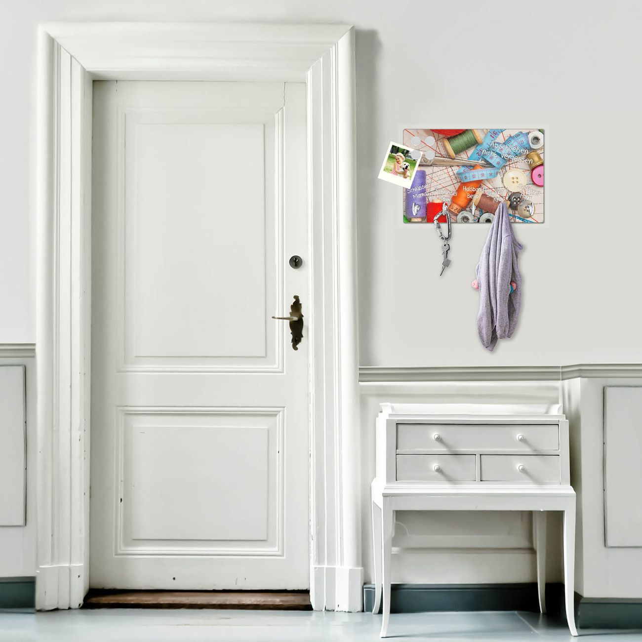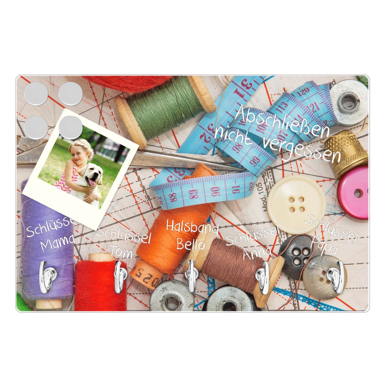 FUNKTION: Mit dem banjado Schlüsselbrett Nähen hat Ihre Suche nach dem Schlüsselbund endlich ein Ende! Auf gesamt 5 Haken finden auch die größten Schlüssel ihren Platz. Durch den farbenfrohen Motivdruck ist das Schlüsselboard ein Blickfang in jeder Wohnung. DESIGN: Die Schlüsselleiste mit Motiv Nähen hat ein sehr ansprechendes und ausgefallenes Design. Das Glasboard besteht aus einer gehärteten Glasscheibe mit dem Motiv Ihrer Wahl. Ihre neue Schlüsselaufbewahrung ist funktionell und ein optisches Highlight. DETAILS: Das Schlüsselbrett ist 30 x 20 x 4,5 CM (BxHxT). Das ganze Board besteht aus gehärtetem Sicherheitsglas, die Haken zur Selbstmontage präsentieren sich in Edelstahl-Optik. Für einen sicheren Halt erfolgt die Aufhängung an 2 vorgefertigten Haltern an der Rückseite. Das Montagematerial fügen wir bei. NUTZEN: Hier findet alles seinen Platz: Schlüsselbunde, Geschirrtücher, Hundeleinen oder Kinderjacken. Das Glas kann mit Kreidestiften bzw. Whiteboard-Marker beschrieben werden, mit extrastarken Neodym-Magneten können Sie auch Notizen anheften. BANJADO: Wir sind ein kleines Team aus dem Herzen von Sachsen und fertigen Ihre neue Schlüsselaufbewahrung von Hand an. Sie erhalten Handarbeit und keine preiswerte Importware. Wir hoffen, dass Ihnen unsere Idee zusagt, herzlichst das banjado Team.