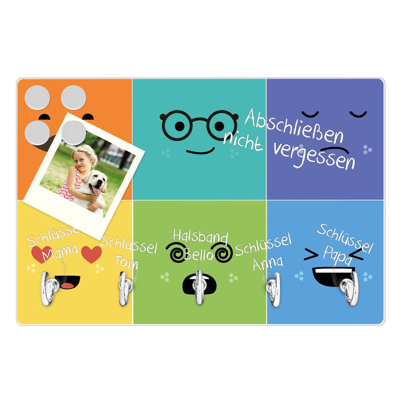 FUNKTION: Mit dem banjado Schlüsselbrett Neun Keinenasen hat Ihre Suche nach dem Schlüsselbund endlich ein Ende! Auf gesamt 5 Haken finden auch die größten Schlüssel ihren Platz. Durch den farbenfrohen Motivdruck ist das Schlüsselboard ein Blickfang in jeder Wohnung. DESIGN: Die Schlüsselleiste mit Motiv Neun Keinenasen hat ein sehr ansprechendes und ausgefallenes Design. Das Glasboard besteht aus einer gehärteten Glasscheibe mit dem Motiv Ihrer Wahl. Ihre neue Schlüsselaufbewahrung ist funktionell und ein optisches Highlight. DETAILS: Das Schlüsselbrett ist 30 x 20 x 4,5 CM (BxHxT). Das ganze Board besteht aus gehärtetem Sicherheitsglas, die Haken zur Selbstmontage präsentieren sich in Edelstahl-Optik. Für einen sicheren Halt erfolgt die Aufhängung an 2 vorgefertigten Haltern an der Rückseite. Das Montagematerial fügen wir bei. NUTZEN: Hier findet alles seinen Platz: Schlüsselbunde, Geschirrtücher, Hundeleinen oder Kinderjacken. Das Glas kann mit Kreidestiften bzw. Whiteboard-Marker beschrieben werden, mit extrastarken Neodym-Magneten können Sie auch Notizen anheften. BANJADO: Wir sind ein kleines Team aus dem Herzen von Sachsen und fertigen Ihre neue Schlüsselaufbewahrung von Hand an. Sie erhalten Handarbeit und keine preiswerte Importware. Wir hoffen, dass Ihnen unsere Idee zusagt, herzlichst das banjado Team.