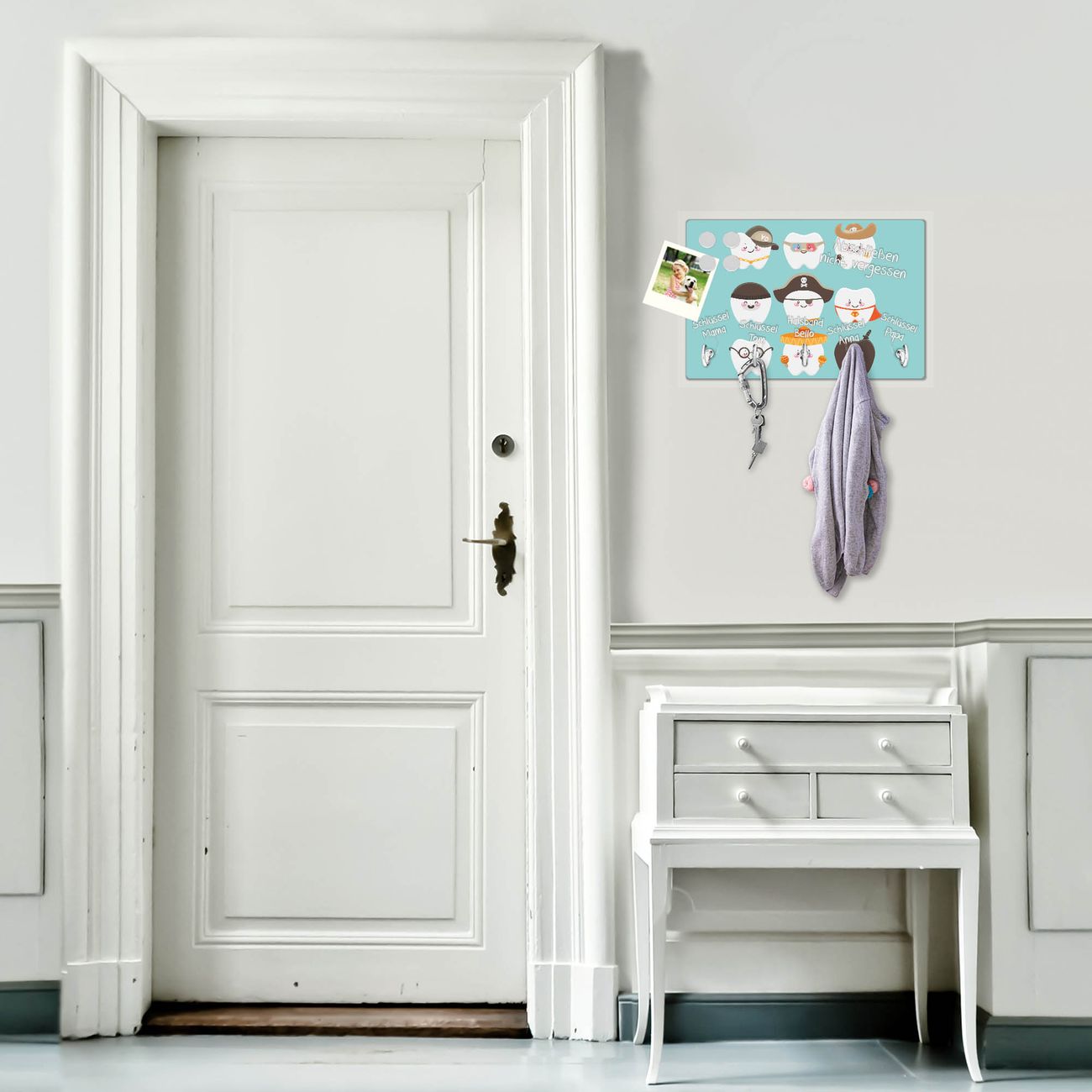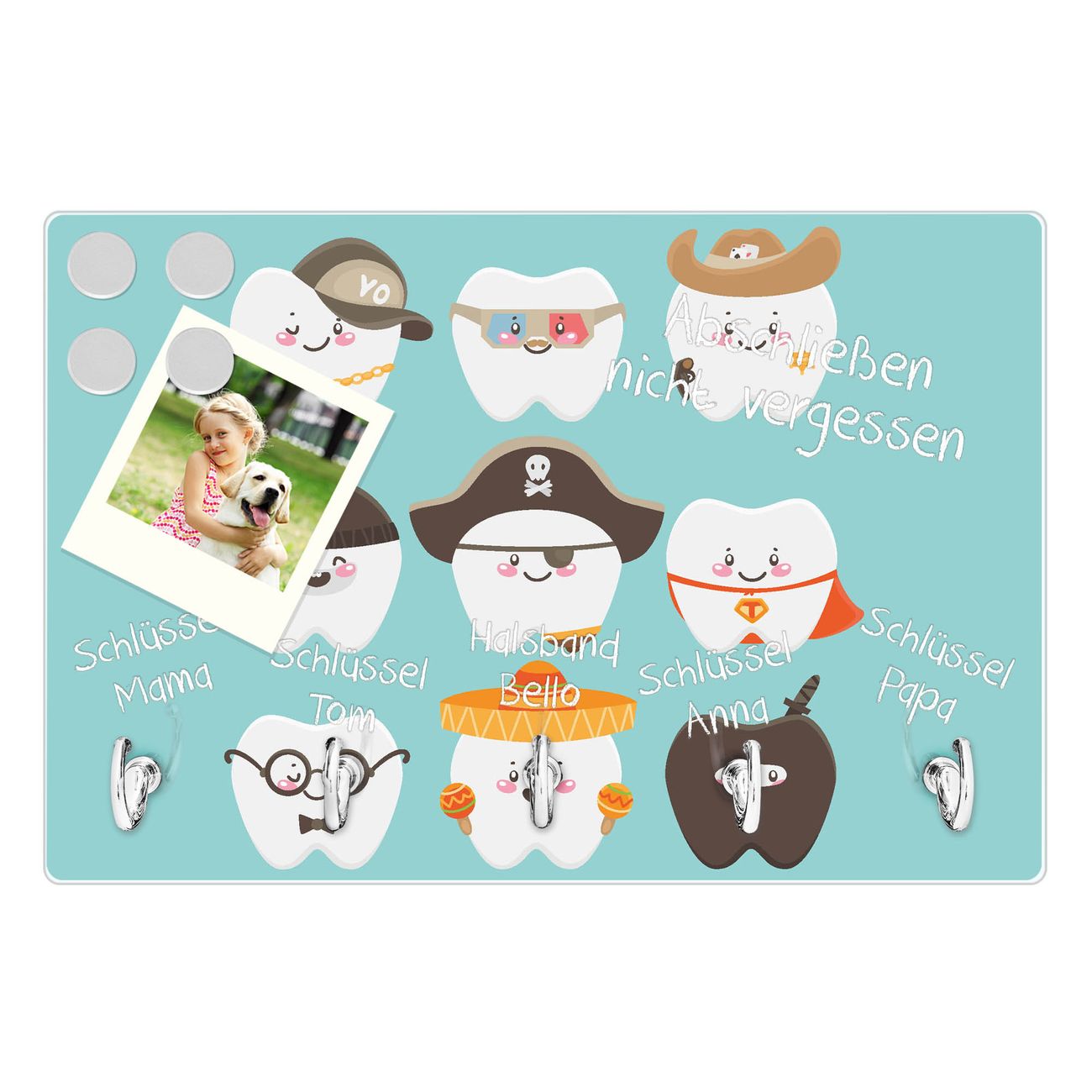 FUNKTION: Mit dem banjado Schlüsselbrett Neun Zähne hat Ihre Suche nach dem Schlüsselbund endlich ein Ende! Auf gesamt 5 Haken finden auch die größten Schlüssel ihren Platz. Durch den farbenfrohen Motivdruck ist das Schlüsselboard ein Blickfang in jeder Wohnung. DESIGN: Die Schlüsselleiste mit Motiv Neun Zähne hat ein sehr ansprechendes und ausgefallenes Design. Das Glasboard besteht aus einer gehärteten Glasscheibe mit dem Motiv Ihrer Wahl. Ihre neue Schlüsselaufbewahrung ist funktionell und ein optisches Highlight. DETAILS: Das Schlüsselbrett ist 30 x 20 x 4,5 CM (BxHxT). Das ganze Board besteht aus gehärtetem Sicherheitsglas, die Haken zur Selbstmontage präsentieren sich in Edelstahl-Optik. Für einen sicheren Halt erfolgt die Aufhängung an 2 vorgefertigten Haltern an der Rückseite. Das Montagematerial fügen wir bei. NUTZEN: Hier findet alles seinen Platz: Schlüsselbunde, Geschirrtücher, Hundeleinen oder Kinderjacken. Das Glas kann mit Kreidestiften bzw. Whiteboard-Marker beschrieben werden, mit extrastarken Neodym-Magneten können Sie auch Notizen anheften. BANJADO: Wir sind ein kleines Team aus dem Herzen von Sachsen und fertigen Ihre neue Schlüsselaufbewahrung von Hand an. Sie erhalten Handarbeit und keine preiswerte Importware. Wir hoffen, dass Ihnen unsere Idee zusagt, herzlichst das banjado Team.