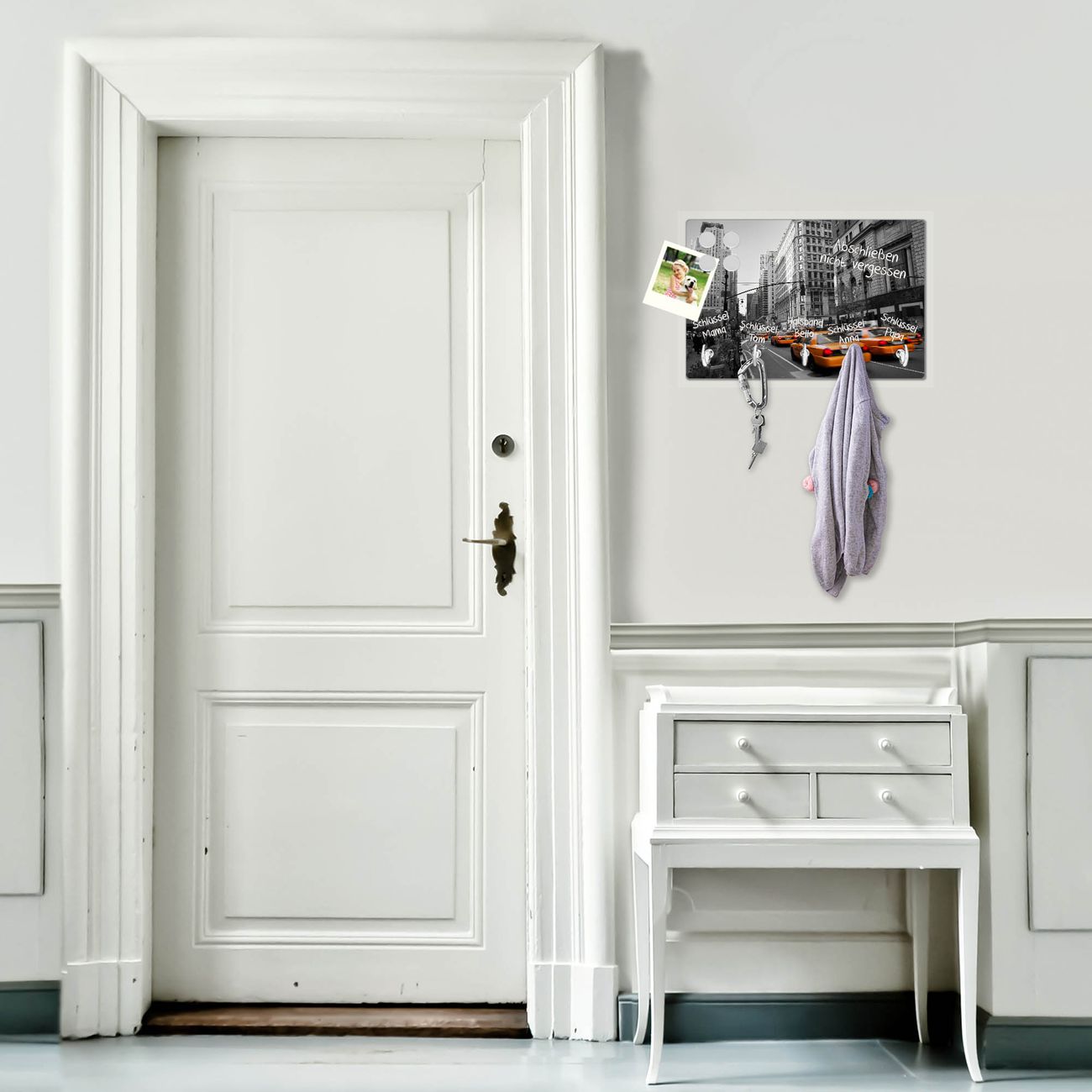 FUNKTION: Mit dem banjado Schlüsselbrett New York Taxi hat Ihre Suche nach dem Schlüsselbund endlich ein Ende! Auf gesamt 5 Haken finden auch die größten Schlüssel ihren Platz. Durch den farbenfrohen Motivdruck ist das Schlüsselboard ein Blickfang in jeder Wohnung. DESIGN: Die Schlüsselleiste mit Motiv New York Taxi hat ein sehr ansprechendes und ausgefallenes Design. Das Glasboard besteht aus einer gehärteten Glasscheibe mit dem Motiv Ihrer Wahl. Ihre neue Schlüsselaufbewahrung ist funktionell und ein optisches Highlight. DETAILS: Das Schlüsselbrett ist 30 x 20 x 4,5 CM (BxHxT). Das ganze Board besteht aus gehärtetem Sicherheitsglas, die Haken zur Selbstmontage präsentieren sich in Edelstahl-Optik. Für einen sicheren Halt erfolgt die Aufhängung an 2 vorgefertigten Haltern an der Rückseite. Das Montagematerial fügen wir bei. NUTZEN: Hier findet alles seinen Platz: Schlüsselbunde, Geschirrtücher, Hundeleinen oder Kinderjacken. Das Glas kann mit Kreidestiften bzw. Whiteboard-Marker beschrieben werden, mit extrastarken Neodym-Magneten können Sie auch Notizen anheften. BANJADO: Wir sind ein kleines Team aus dem Herzen von Sachsen und fertigen Ihre neue Schlüsselaufbewahrung von Hand an. Sie erhalten Handarbeit und keine preiswerte Importware. Wir hoffen, dass Ihnen unsere Idee zusagt, herzlichst das banjado Team.