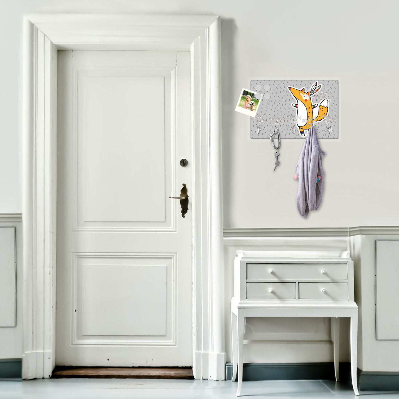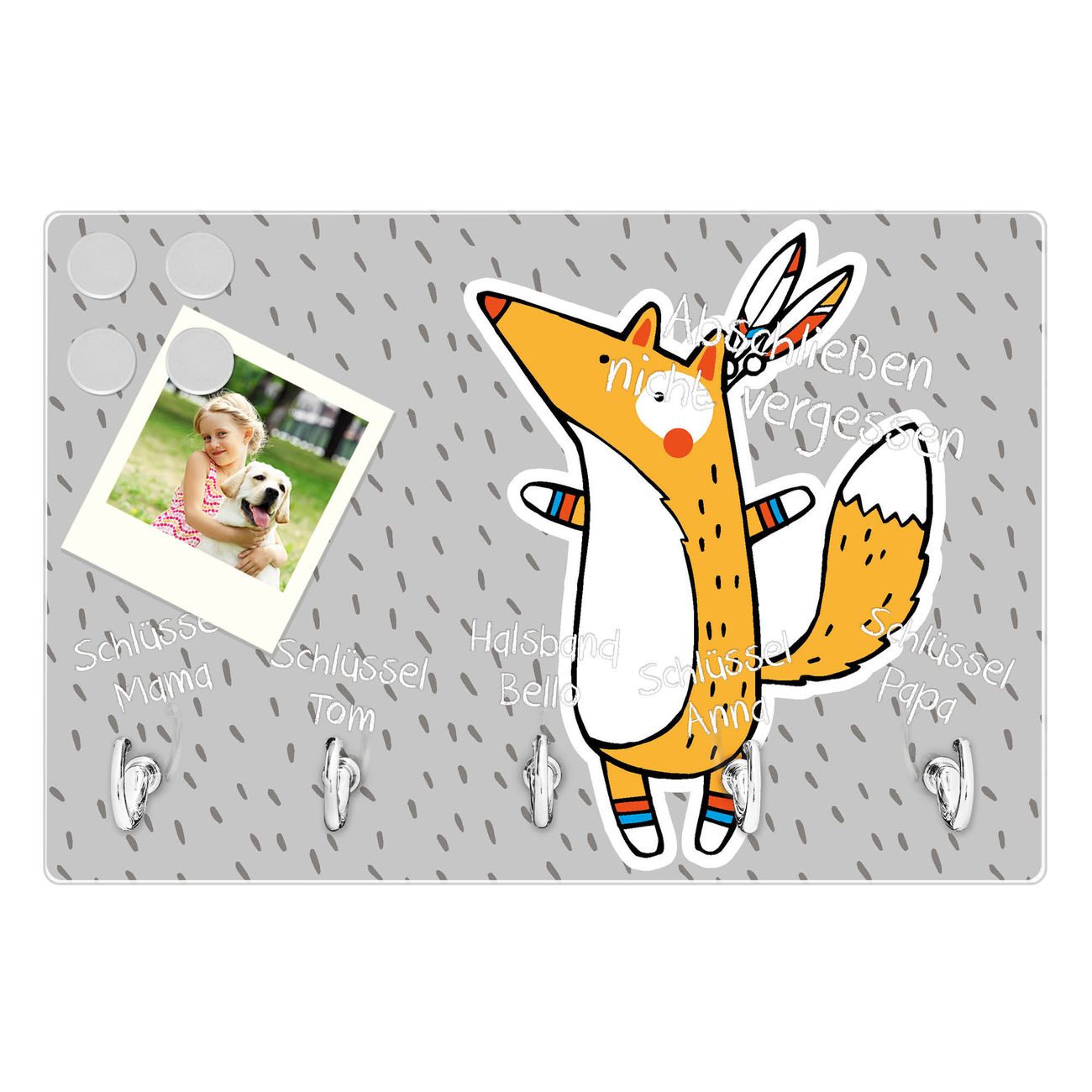 FUNKTION: Mit dem banjado Schlüsselbrett Nils hat Ihre Suche nach dem Schlüsselbund endlich ein Ende! Auf gesamt 5 Haken finden auch die größten Schlüssel ihren Platz. Durch den farbenfrohen Motivdruck ist das Schlüsselboard ein Blickfang in jeder Wohnung. DESIGN: Die Schlüsselleiste mit Motiv Nils hat ein sehr ansprechendes und ausgefallenes Design. Das Glasboard besteht aus einer gehärteten Glasscheibe mit dem Motiv Ihrer Wahl. Ihre neue Schlüsselaufbewahrung ist funktionell und ein optisches Highlight. DETAILS: Das Schlüsselbrett ist 30 x 20 x 4,5 CM (BxHxT). Das ganze Board besteht aus gehärtetem Sicherheitsglas, die Haken zur Selbstmontage präsentieren sich in Edelstahl-Optik. Für einen sicheren Halt erfolgt die Aufhängung an 2 vorgefertigten Haltern an der Rückseite. Das Montagematerial fügen wir bei. NUTZEN: Hier findet alles seinen Platz: Schlüsselbunde, Geschirrtücher, Hundeleinen oder Kinderjacken. Das Glas kann mit Kreidestiften bzw. Whiteboard-Marker beschrieben werden, mit extrastarken Neodym-Magneten können Sie auch Notizen anheften. BANJADO: Wir sind ein kleines Team aus dem Herzen von Sachsen und fertigen Ihre neue Schlüsselaufbewahrung von Hand an. Sie erhalten Handarbeit und keine preiswerte Importware. Wir hoffen, dass Ihnen unsere Idee zusagt, herzlichst das banjado Team.