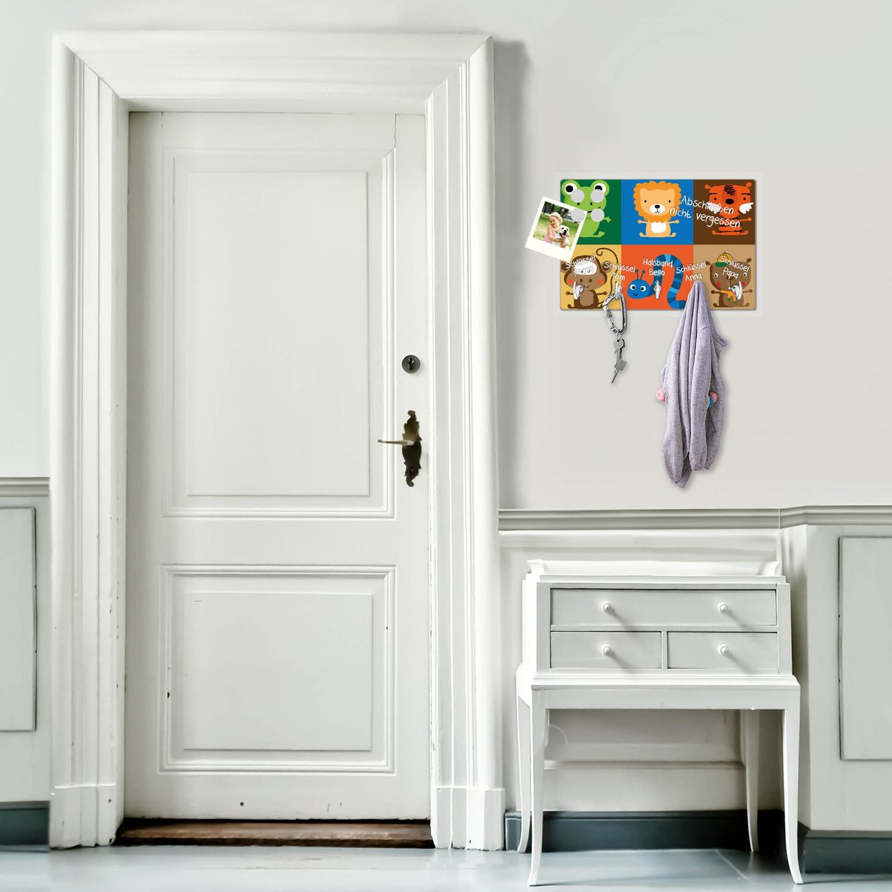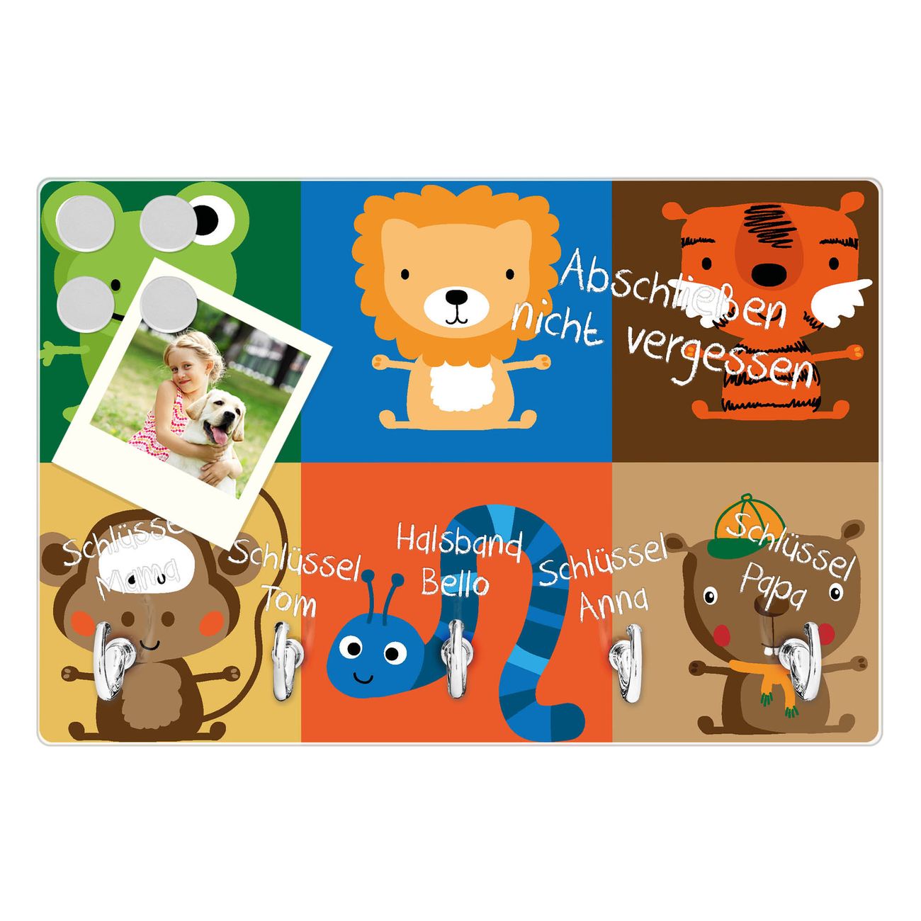 FUNKTION: Mit dem banjado Schlüsselbrett Offene Arme hat Ihre Suche nach dem Schlüsselbund endlich ein Ende! Auf gesamt 5 Haken finden auch die größten Schlüssel ihren Platz. Durch den farbenfrohen Motivdruck ist das Schlüsselboard ein Blickfang in jeder Wohnung. DESIGN: Die Schlüsselleiste mit Motiv Offene Arme hat ein sehr ansprechendes und ausgefallenes Design. Das Glasboard besteht aus einer gehärteten Glasscheibe mit dem Motiv Ihrer Wahl. Ihre neue Schlüsselaufbewahrung ist funktionell und ein optisches Highlight. DETAILS: Das Schlüsselbrett ist 30 x 20 x 4,5 CM (BxHxT). Das ganze Board besteht aus gehärtetem Sicherheitsglas, die Haken zur Selbstmontage präsentieren sich in Edelstahl-Optik. Für einen sicheren Halt erfolgt die Aufhängung an 2 vorgefertigten Haltern an der Rückseite. Das Montagematerial fügen wir bei. NUTZEN: Hier findet alles seinen Platz: Schlüsselbunde, Geschirrtücher, Hundeleinen oder Kinderjacken. Das Glas kann mit Kreidestiften bzw. Whiteboard-Marker beschrieben werden, mit extrastarken Neodym-Magneten können Sie auch Notizen anheften. BANJADO: Wir sind ein kleines Team aus dem Herzen von Sachsen und fertigen Ihre neue Schlüsselaufbewahrung von Hand an. Sie erhalten Handarbeit und keine preiswerte Importware. Wir hoffen, dass Ihnen unsere Idee zusagt, herzlichst das banjado Team.