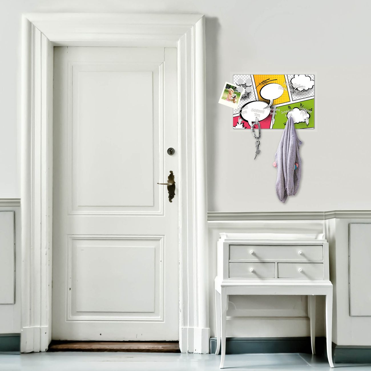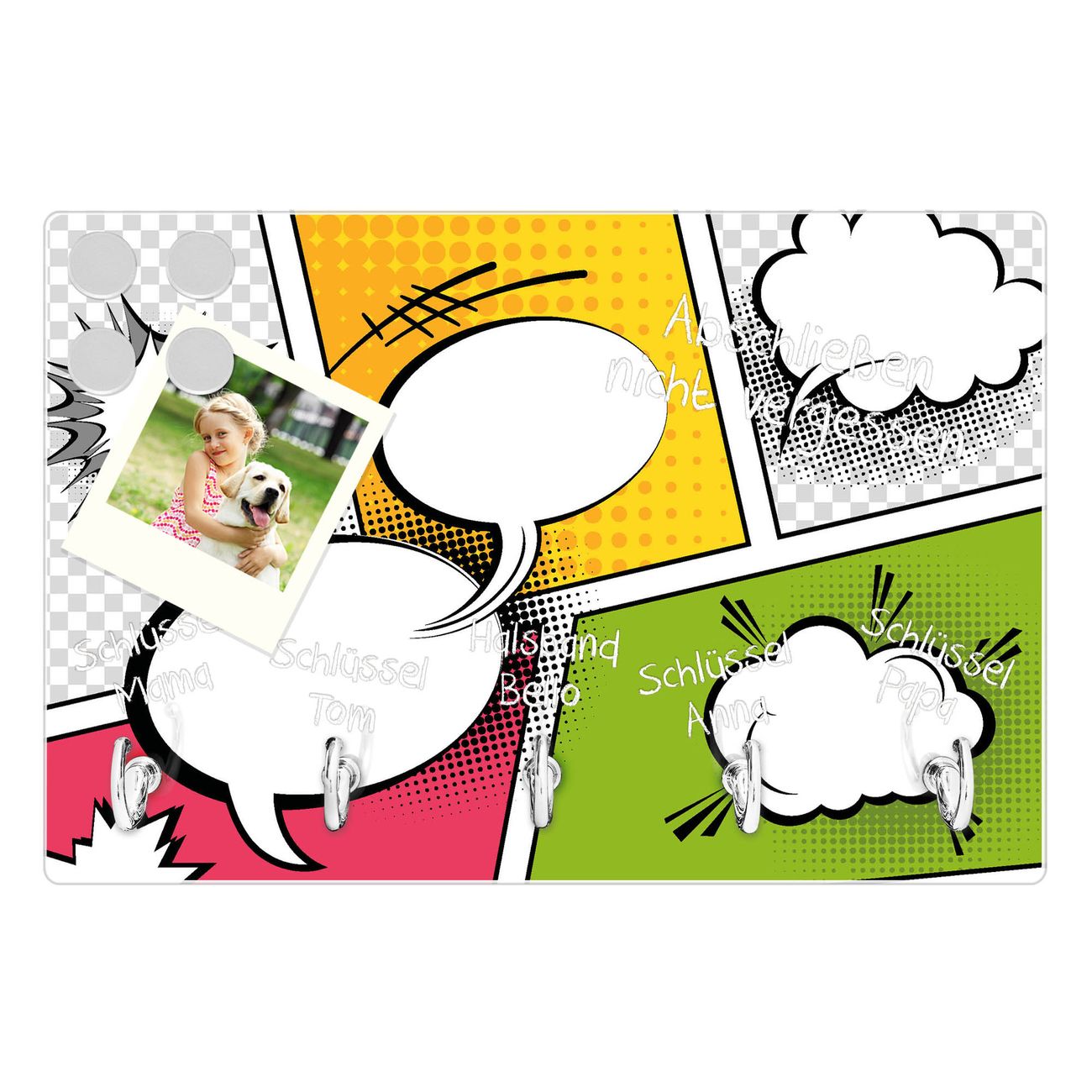 FUNKTION: Mit dem banjado Schlüsselbrett Ohne Worte hat Ihre Suche nach dem Schlüsselbund endlich ein Ende! Auf gesamt 5 Haken finden auch die größten Schlüssel ihren Platz. Durch den farbenfrohen Motivdruck ist das Schlüsselboard ein Blickfang in jeder Wohnung. DESIGN: Die Schlüsselleiste mit Motiv Ohne Worte hat ein sehr ansprechendes und ausgefallenes Design. Das Glasboard besteht aus einer gehärteten Glasscheibe mit dem Motiv Ihrer Wahl. Ihre neue Schlüsselaufbewahrung ist funktionell und ein optisches Highlight. DETAILS: Das Schlüsselbrett ist 30 x 20 x 4,5 CM (BxHxT). Das ganze Board besteht aus gehärtetem Sicherheitsglas, die Haken zur Selbstmontage präsentieren sich in Edelstahl-Optik. Für einen sicheren Halt erfolgt die Aufhängung an 2 vorgefertigten Haltern an der Rückseite. Das Montagematerial fügen wir bei. NUTZEN: Hier findet alles seinen Platz: Schlüsselbunde, Geschirrtücher, Hundeleinen oder Kinderjacken. Das Glas kann mit Kreidestiften bzw. Whiteboard-Marker beschrieben werden, mit extrastarken Neodym-Magneten können Sie auch Notizen anheften. BANJADO: Wir sind ein kleines Team aus dem Herzen von Sachsen und fertigen Ihre neue Schlüsselaufbewahrung von Hand an. Sie erhalten Handarbeit und keine preiswerte Importware. Wir hoffen, dass Ihnen unsere Idee zusagt, herzlichst das banjado Team.