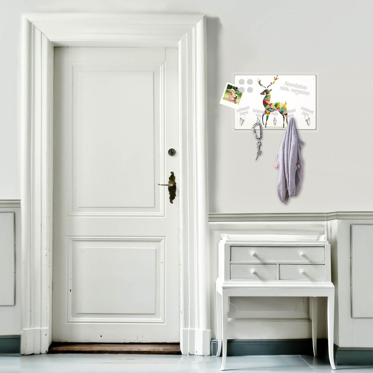 FUNKTION: Mit dem banjado Schlüsselbrett Origami Hirsch hat Ihre Suche nach dem Schlüsselbund endlich ein Ende! Auf gesamt 5 Haken finden auch die größten Schlüssel ihren Platz. Durch den farbenfrohen Motivdruck ist das Schlüsselboard ein Blickfang in jeder Wohnung. DESIGN: Die Schlüsselleiste mit Motiv Origami Hirsch hat ein sehr ansprechendes und ausgefallenes Design. Das Glasboard besteht aus einer gehärteten Glasscheibe mit dem Motiv Ihrer Wahl. Ihre neue Schlüsselaufbewahrung ist funktionell und ein optisches Highlight. DETAILS: Das Schlüsselbrett ist 30 x 20 x 4,5 CM (BxHxT). Das ganze Board besteht aus gehärtetem Sicherheitsglas, die Haken zur Selbstmontage präsentieren sich in Edelstahl-Optik. Für einen sicheren Halt erfolgt die Aufhängung an 2 vorgefertigten Haltern an der Rückseite. Das Montagematerial fügen wir bei. NUTZEN: Hier findet alles seinen Platz: Schlüsselbunde, Geschirrtücher, Hundeleinen oder Kinderjacken. Das Glas kann mit Kreidestiften bzw. Whiteboard-Marker beschrieben werden, mit extrastarken Neodym-Magneten können Sie auch Notizen anheften. BANJADO: Wir sind ein kleines Team aus dem Herzen von Sachsen und fertigen Ihre neue Schlüsselaufbewahrung von Hand an. Sie erhalten Handarbeit und keine preiswerte Importware. Wir hoffen, dass Ihnen unsere Idee zusagt, herzlichst das banjado Team.