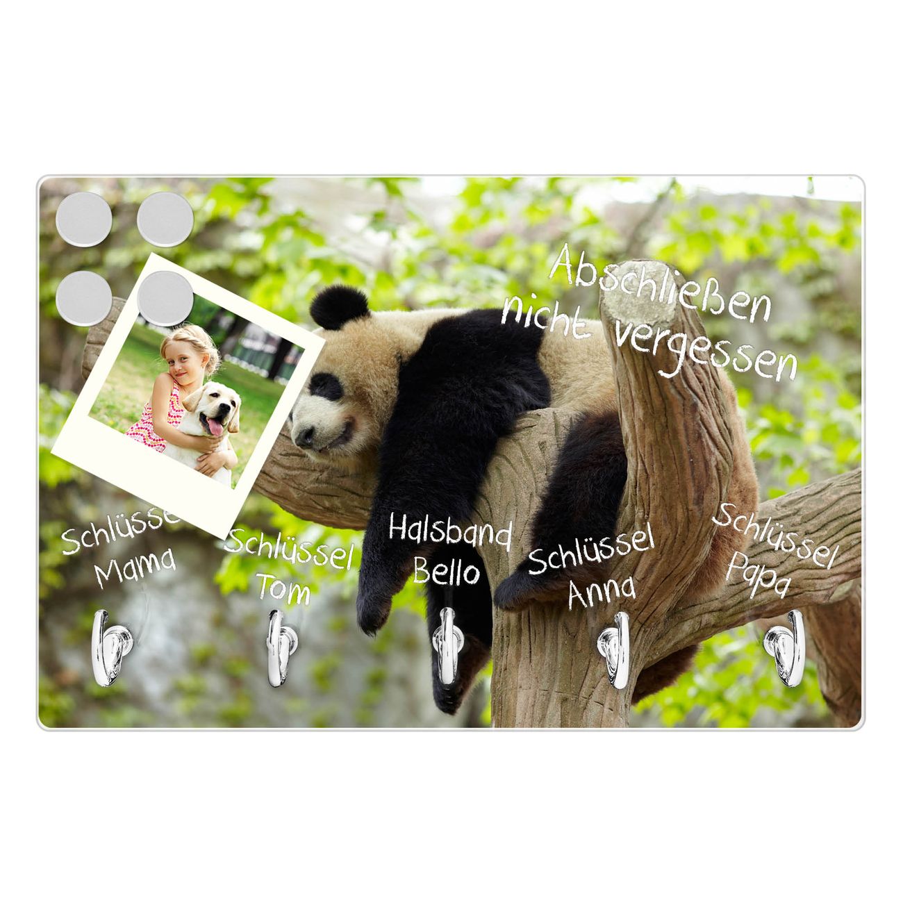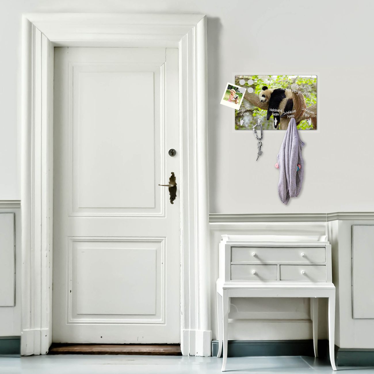 FUNKTION: Mit dem banjado Schlüsselbrett Panda hat Ihre Suche nach dem Schlüsselbund endlich ein Ende! Auf gesamt 5 Haken finden auch die größten Schlüssel ihren Platz. Durch den farbenfrohen Motivdruck ist das Schlüsselboard ein Blickfang in jeder Wohnung. DESIGN: Die Schlüsselleiste mit Motiv Panda hat ein sehr ansprechendes und ausgefallenes Design. Das Glasboard besteht aus einer gehärteten Glasscheibe mit dem Motiv Ihrer Wahl. Ihre neue Schlüsselaufbewahrung ist funktionell und ein optisches Highlight. DETAILS: Das Schlüsselbrett ist 30 x 20 x 4,5 CM (BxHxT). Das ganze Board besteht aus gehärtetem Sicherheitsglas, die Haken zur Selbstmontage präsentieren sich in Edelstahl-Optik. Für einen sicheren Halt erfolgt die Aufhängung an 2 vorgefertigten Haltern an der Rückseite. Das Montagematerial fügen wir bei. NUTZEN: Hier findet alles seinen Platz: Schlüsselbunde, Geschirrtücher, Hundeleinen oder Kinderjacken. Das Glas kann mit Kreidestiften bzw. Whiteboard-Marker beschrieben werden, mit extrastarken Neodym-Magneten können Sie auch Notizen anheften. BANJADO: Wir sind ein kleines Team aus dem Herzen von Sachsen und fertigen Ihre neue Schlüsselaufbewahrung von Hand an. Sie erhalten Handarbeit und keine preiswerte Importware. Wir hoffen, dass Ihnen unsere Idee zusagt, herzlichst das banjado Team.