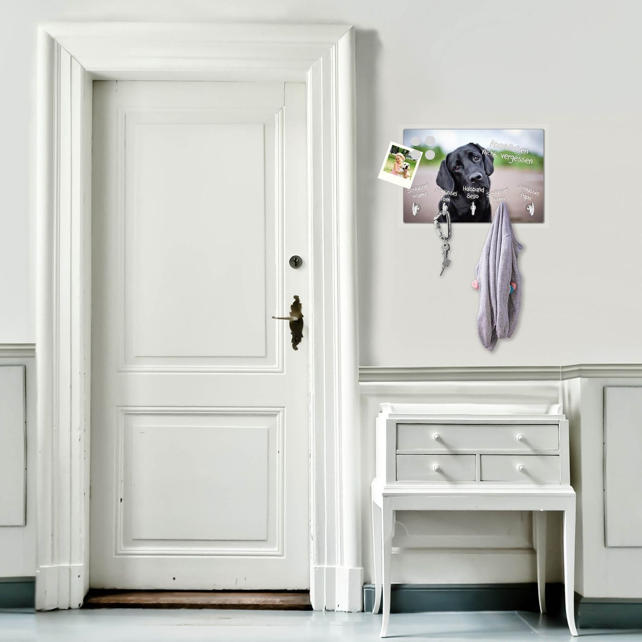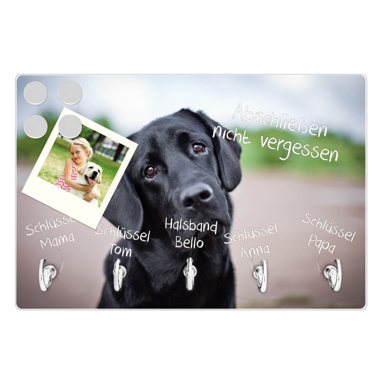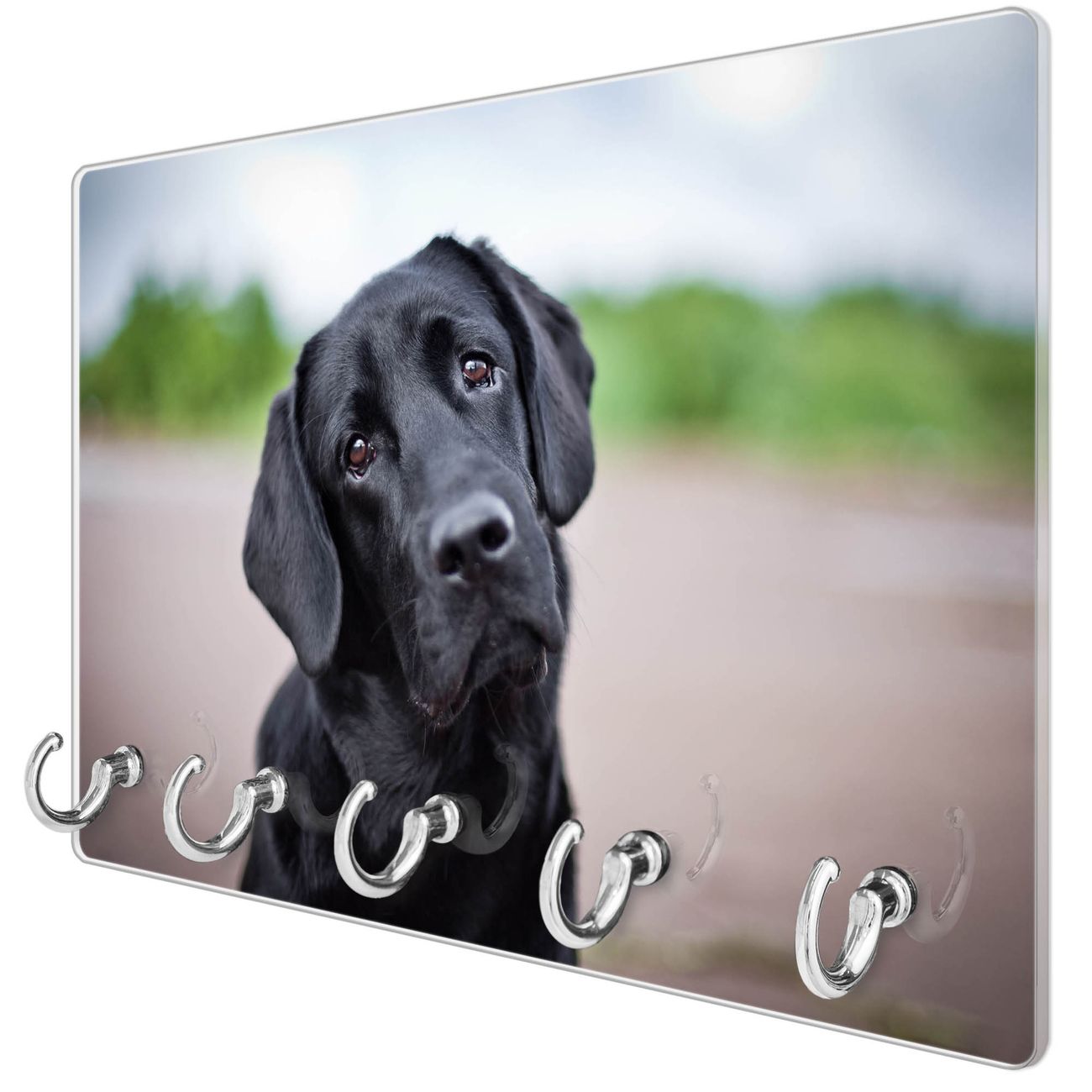 FUNKTION: Mit dem banjado Schlüsselbrett Paolo hat Ihre Suche nach dem Schlüsselbund endlich ein Ende! Auf gesamt 5 Haken finden auch die größten Schlüssel ihren Platz. Durch den farbenfrohen Motivdruck ist das Schlüsselboard ein Blickfang in jeder Wohnung. DESIGN: Die Schlüsselleiste mit Motiv Paolo hat ein sehr ansprechendes und ausgefallenes Design. Das Glasboard besteht aus einer gehärteten Glasscheibe mit dem Motiv Ihrer Wahl. Ihre neue Schlüsselaufbewahrung ist funktionell und ein optisches Highlight. DETAILS: Das Schlüsselbrett ist 30 x 20 x 4,5 CM (BxHxT). Das ganze Board besteht aus gehärtetem Sicherheitsglas, die Haken zur Selbstmontage präsentieren sich in Edelstahl-Optik. Für einen sicheren Halt erfolgt die Aufhängung an 2 vorgefertigten Haltern an der Rückseite. Das Montagematerial fügen wir bei. NUTZEN: Hier findet alles seinen Platz: Schlüsselbunde, Geschirrtücher, Hundeleinen oder Kinderjacken. Das Glas kann mit Kreidestiften bzw. Whiteboard-Marker beschrieben werden, mit extrastarken Neodym-Magneten können Sie auch Notizen anheften. BANJADO: Wir sind ein kleines Team aus dem Herzen von Sachsen und fertigen Ihre neue Schlüsselaufbewahrung von Hand an. Sie erhalten Handarbeit und keine preiswerte Importware. Wir hoffen, dass Ihnen unsere Idee zusagt, herzlichst das banjado Team.