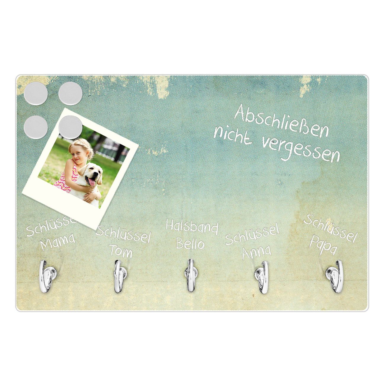 FUNKTION: Mit dem banjado Schlüsselbrett Patina Papier hat Ihre Suche nach dem Schlüsselbund endlich ein Ende! Auf gesamt 5 Haken finden auch die größten Schlüssel ihren Platz. Durch den farbenfrohen Motivdruck ist das Schlüsselboard ein Blickfang in jeder Wohnung. DESIGN: Die Schlüsselleiste mit Motiv Patina Papier hat ein sehr ansprechendes und ausgefallenes Design. Das Glasboard besteht aus einer gehärteten Glasscheibe mit dem Motiv Ihrer Wahl. Ihre neue Schlüsselaufbewahrung ist funktionell und ein optisches Highlight. DETAILS: Das Schlüsselbrett ist 30 x 20 x 4,5 CM (BxHxT). Das ganze Board besteht aus gehärtetem Sicherheitsglas, die Haken zur Selbstmontage präsentieren sich in Edelstahl-Optik. Für einen sicheren Halt erfolgt die Aufhängung an 2 vorgefertigten Haltern an der Rückseite. Das Montagematerial fügen wir bei. NUTZEN: Hier findet alles seinen Platz: Schlüsselbunde, Geschirrtücher, Hundeleinen oder Kinderjacken. Das Glas kann mit Kreidestiften bzw. Whiteboard-Marker beschrieben werden, mit extrastarken Neodym-Magneten können Sie auch Notizen anheften. BANJADO: Wir sind ein kleines Team aus dem Herzen von Sachsen und fertigen Ihre neue Schlüsselaufbewahrung von Hand an. Sie erhalten Handarbeit und keine preiswerte Importware. Wir hoffen, dass Ihnen unsere Idee zusagt, herzlichst das banjado Team.