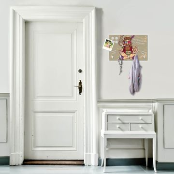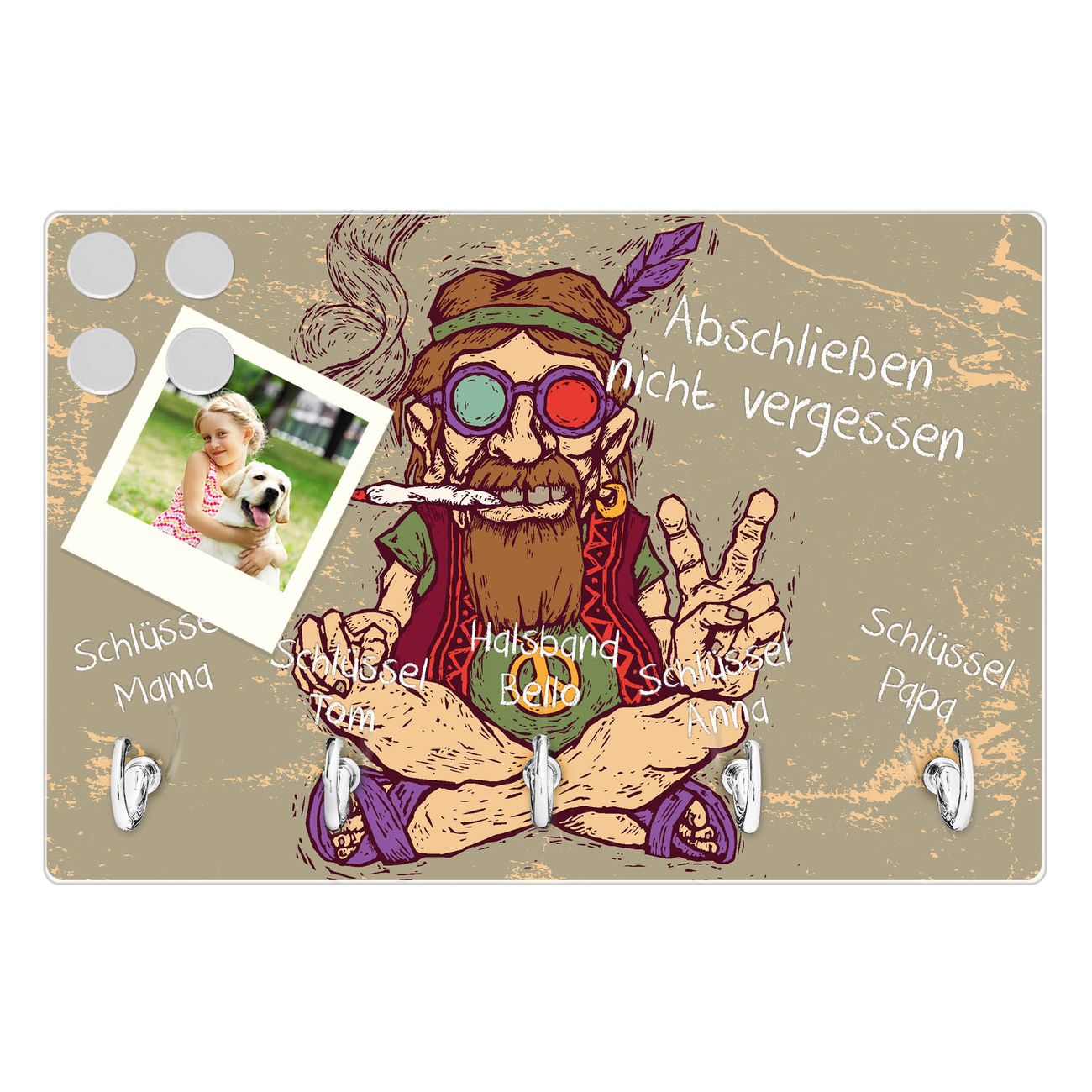 FUNKTION: Mit dem banjado Schlüsselbrett Peace hat Ihre Suche nach dem Schlüsselbund endlich ein Ende! Auf gesamt 5 Haken finden auch die größten Schlüssel ihren Platz. Durch den farbenfrohen Motivdruck ist das Schlüsselboard ein Blickfang in jeder Wohnung. DESIGN: Die Schlüsselleiste mit Motiv Peace hat ein sehr ansprechendes und ausgefallenes Design. Das Glasboard besteht aus einer gehärteten Glasscheibe mit dem Motiv Ihrer Wahl. Ihre neue Schlüsselaufbewahrung ist funktionell und ein optisches Highlight. DETAILS: Das Schlüsselbrett ist 30 x 20 x 4,5 CM (BxHxT). Das ganze Board besteht aus gehärtetem Sicherheitsglas, die Haken zur Selbstmontage präsentieren sich in Edelstahl-Optik. Für einen sicheren Halt erfolgt die Aufhängung an 2 vorgefertigten Haltern an der Rückseite. Das Montagematerial fügen wir bei. NUTZEN: Hier findet alles seinen Platz: Schlüsselbunde, Geschirrtücher, Hundeleinen oder Kinderjacken. Das Glas kann mit Kreidestiften bzw. Whiteboard-Marker beschrieben werden, mit extrastarken Neodym-Magneten können Sie auch Notizen anheften. BANJADO: Wir sind ein kleines Team aus dem Herzen von Sachsen und fertigen Ihre neue Schlüsselaufbewahrung von Hand an. Sie erhalten Handarbeit und keine preiswerte Importware. Wir hoffen, dass Ihnen unsere Idee zusagt, herzlichst das banjado Team.