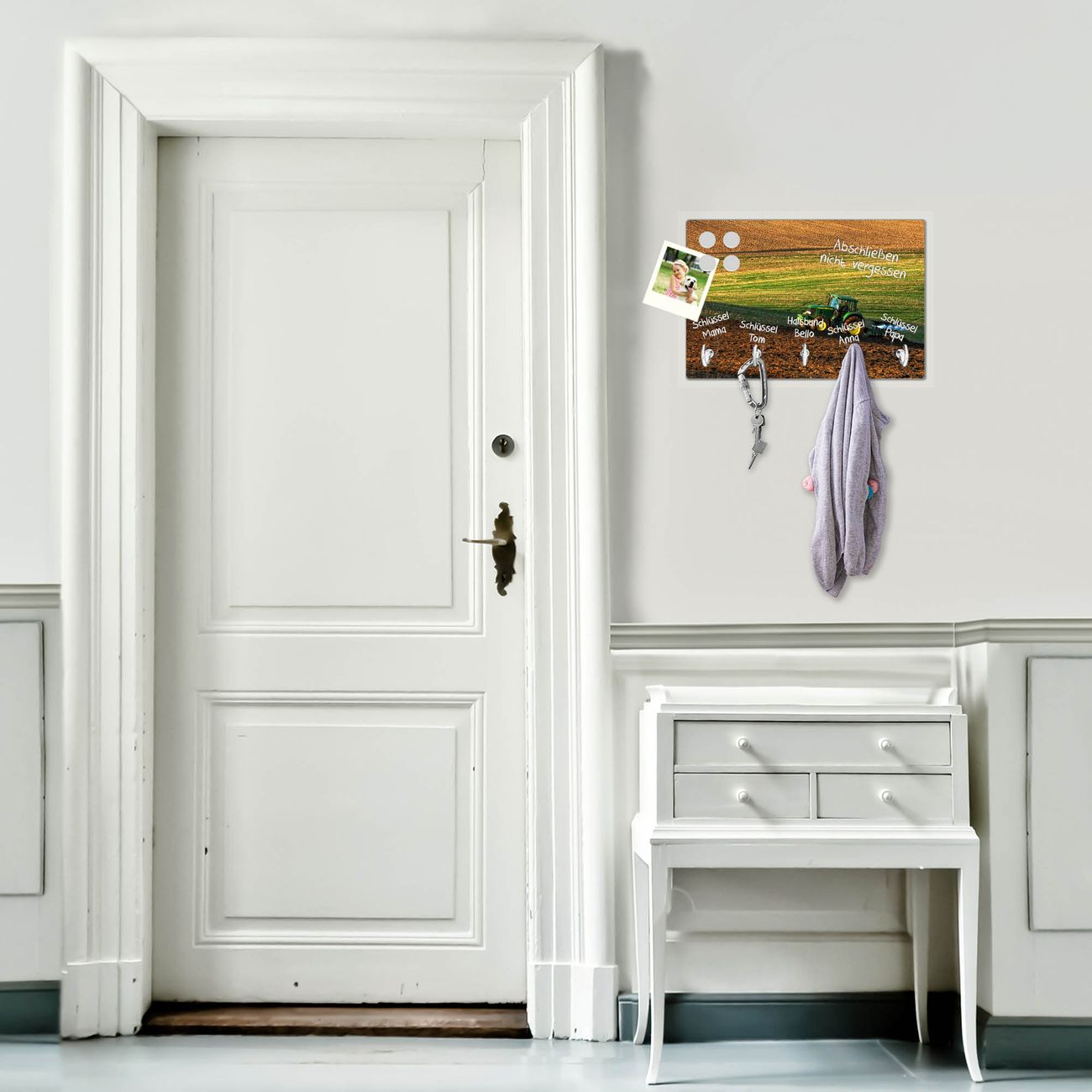FUNKTION: Mit dem banjado Schlüsselbrett Pflügen hat Ihre Suche nach dem Schlüsselbund endlich ein Ende! Auf gesamt 5 Haken finden auch die größten Schlüssel ihren Platz. Durch den farbenfrohen Motivdruck ist das Schlüsselboard ein Blickfang in jeder Wohnung. DESIGN: Die Schlüsselleiste mit Motiv Pflügen hat ein sehr ansprechendes und ausgefallenes Design. Das Glasboard besteht aus einer gehärteten Glasscheibe mit dem Motiv Ihrer Wahl. Ihre neue Schlüsselaufbewahrung ist funktionell und ein optisches Highlight. DETAILS: Das Schlüsselbrett ist 30 x 20 x 4,5 CM (BxHxT). Das ganze Board besteht aus gehärtetem Sicherheitsglas, die Haken zur Selbstmontage präsentieren sich in Edelstahl-Optik. Für einen sicheren Halt erfolgt die Aufhängung an 2 vorgefertigten Haltern an der Rückseite. Das Montagematerial fügen wir bei. NUTZEN: Hier findet alles seinen Platz: Schlüsselbunde, Geschirrtücher, Hundeleinen oder Kinderjacken. Das Glas kann mit Kreidestiften bzw. Whiteboard-Marker beschrieben werden, mit extrastarken Neodym-Magneten können Sie auch Notizen anheften. BANJADO: Wir sind ein kleines Team aus dem Herzen von Sachsen und fertigen Ihre neue Schlüsselaufbewahrung von Hand an. Sie erhalten Handarbeit und keine preiswerte Importware. Wir hoffen, dass Ihnen unsere Idee zusagt, herzlichst das banjado Team.