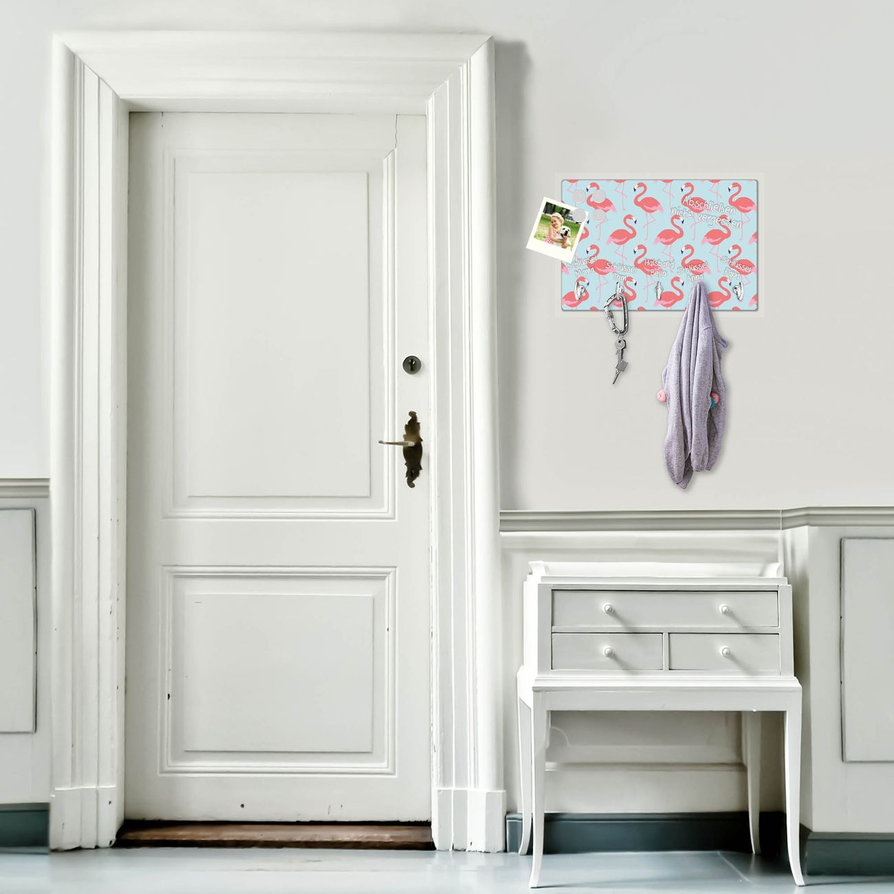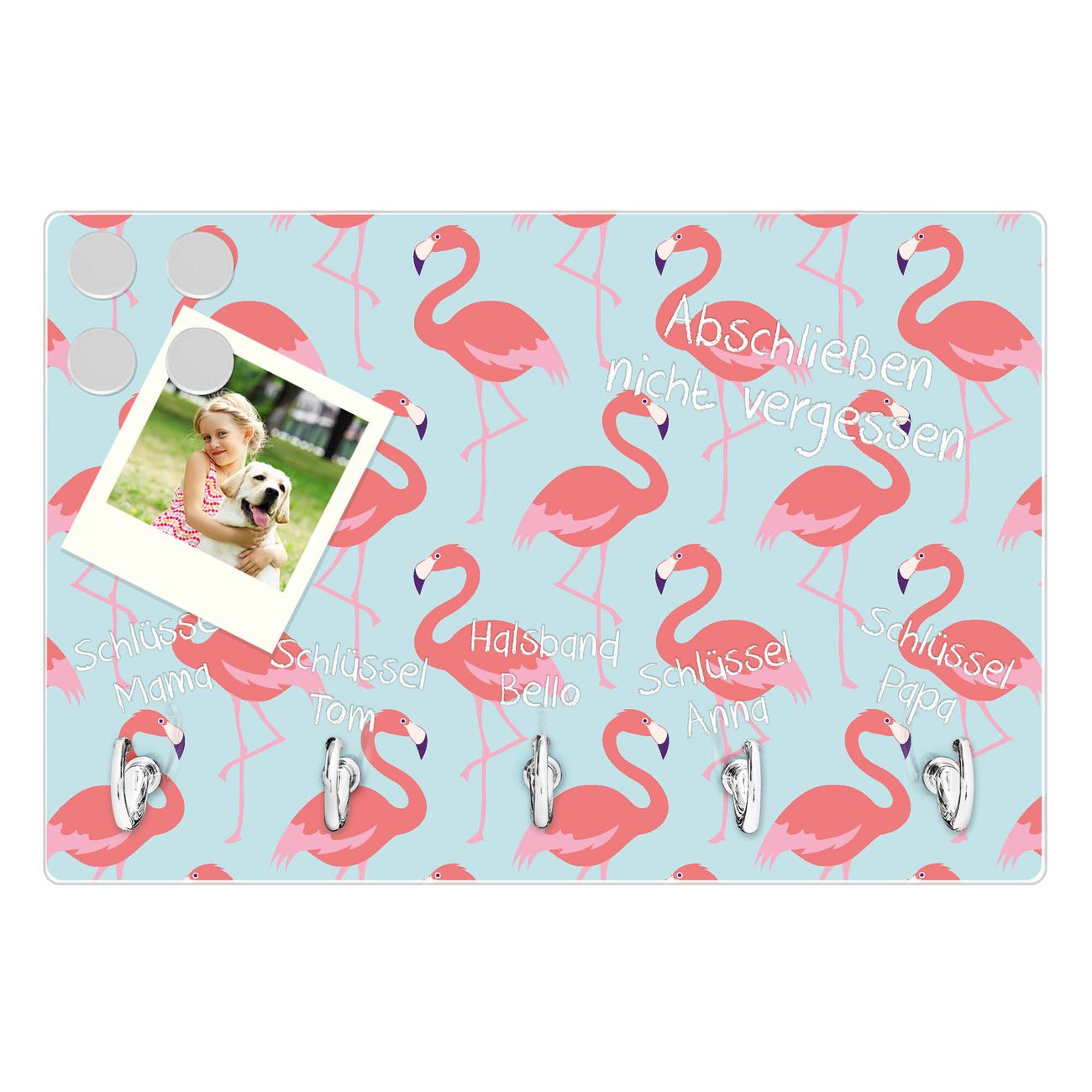 FUNKTION: Mit dem banjado Schlüsselbrett Pink Tango hat Ihre Suche nach dem Schlüsselbund endlich ein Ende! Auf gesamt 5 Haken finden auch die größten Schlüssel ihren Platz. Durch den farbenfrohen Motivdruck ist das Schlüsselboard ein Blickfang in jeder Wohnung. DESIGN: Die Schlüsselleiste mit Motiv Pink Tango hat ein sehr ansprechendes und ausgefallenes Design. Das Glasboard besteht aus einer gehärteten Glasscheibe mit dem Motiv Ihrer Wahl. Ihre neue Schlüsselaufbewahrung ist funktionell und ein optisches Highlight. DETAILS: Das Schlüsselbrett ist 30 x 20 x 4,5 CM (BxHxT). Das ganze Board besteht aus gehärtetem Sicherheitsglas, die Haken zur Selbstmontage präsentieren sich in Edelstahl-Optik. Für einen sicheren Halt erfolgt die Aufhängung an 2 vorgefertigten Haltern an der Rückseite. Das Montagematerial fügen wir bei. NUTZEN: Hier findet alles seinen Platz: Schlüsselbunde, Geschirrtücher, Hundeleinen oder Kinderjacken. Das Glas kann mit Kreidestiften bzw. Whiteboard-Marker beschrieben werden, mit extrastarken Neodym-Magneten können Sie auch Notizen anheften. BANJADO: Wir sind ein kleines Team aus dem Herzen von Sachsen und fertigen Ihre neue Schlüsselaufbewahrung von Hand an. Sie erhalten Handarbeit und keine preiswerte Importware. Wir hoffen, dass Ihnen unsere Idee zusagt, herzlichst das banjado Team.