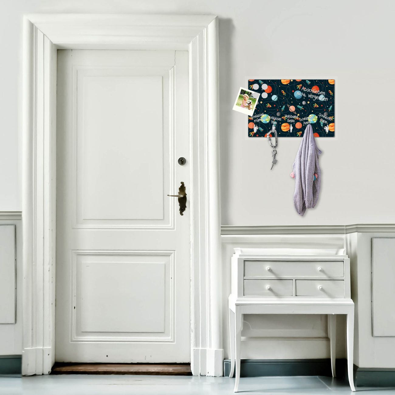 FUNKTION: Mit dem banjado Schlüsselbrett Planet Cruiser hat Ihre Suche nach dem Schlüsselbund endlich ein Ende! Auf gesamt 5 Haken finden auch die größten Schlüssel ihren Platz. Durch den farbenfrohen Motivdruck ist das Schlüsselboard ein Blickfang in jeder Wohnung. DESIGN: Die Schlüsselleiste mit Motiv Planet Cruiser hat ein sehr ansprechendes und ausgefallenes Design. Das Glasboard besteht aus einer gehärteten Glasscheibe mit dem Motiv Ihrer Wahl. Ihre neue Schlüsselaufbewahrung ist funktionell und ein optisches Highlight. DETAILS: Das Schlüsselbrett ist 30 x 20 x 4,5 CM (BxHxT). Das ganze Board besteht aus gehärtetem Sicherheitsglas, die Haken zur Selbstmontage präsentieren sich in Edelstahl-Optik. Für einen sicheren Halt erfolgt die Aufhängung an 2 vorgefertigten Haltern an der Rückseite. Das Montagematerial fügen wir bei. NUTZEN: Hier findet alles seinen Platz: Schlüsselbunde, Geschirrtücher, Hundeleinen oder Kinderjacken. Das Glas kann mit Kreidestiften bzw. Whiteboard-Marker beschrieben werden, mit extrastarken Neodym-Magneten können Sie auch Notizen anheften. BANJADO: Wir sind ein kleines Team aus dem Herzen von Sachsen und fertigen Ihre neue Schlüsselaufbewahrung von Hand an. Sie erhalten Handarbeit und keine preiswerte Importware. Wir hoffen, dass Ihnen unsere Idee zusagt, herzlichst das banjado Team.